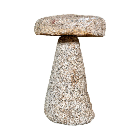 An 18th-century staddle stone, expertly crafted from granite, sourced from England, and both antique and reclaimed. This historic piece comprises two separate components: a base and a cap, which, when stacked together, form a complete staddle stone. Originally, these stones elevated granaries and haystacks off the ground to allow air circulation, preventing rot. More importantly, the cap protected the stored contents by keeping them out of reach of mice and other vermin.