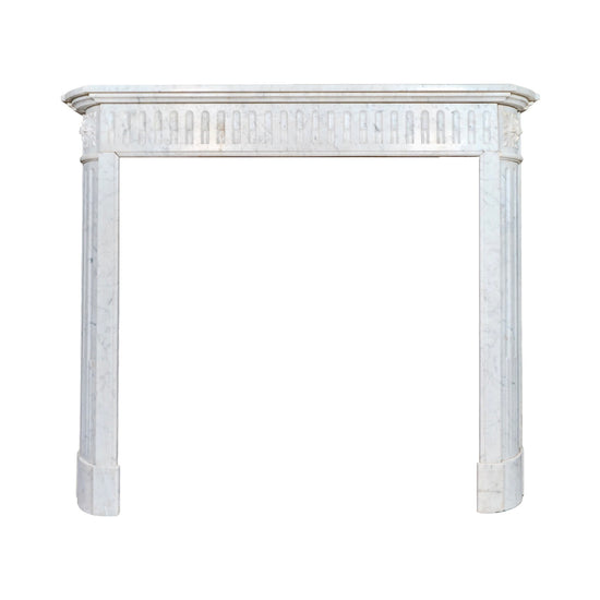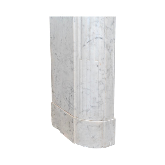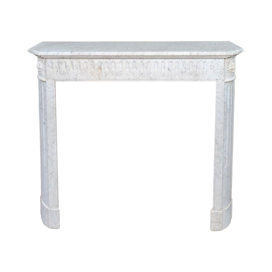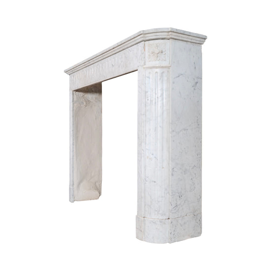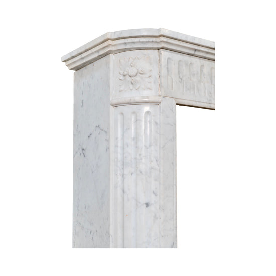 Subtle moldings crown the piece, completing the composition with understated sophistication. With its harmonious proportions and fine detailing, this Carrara marble mantel reflects the artistry of 19th-century French stone carving and stands as a versatile statement piece for both traditional and modern settings.