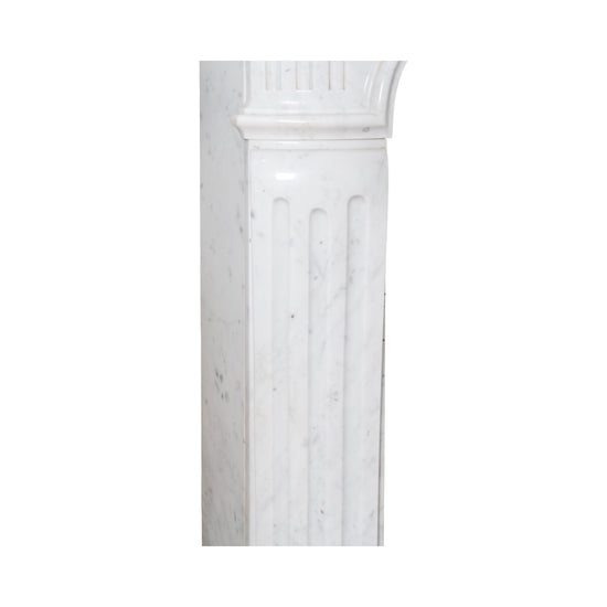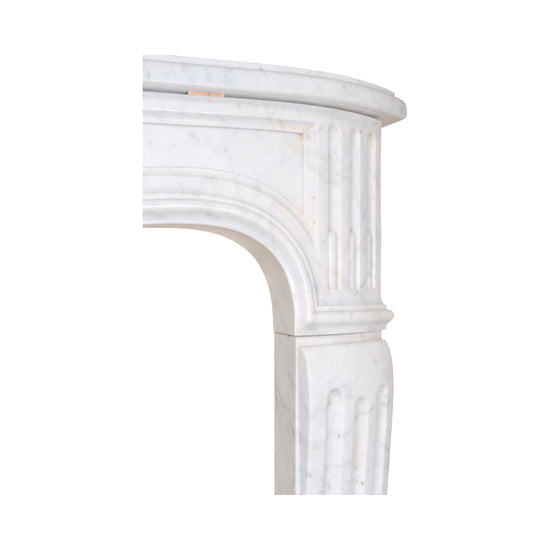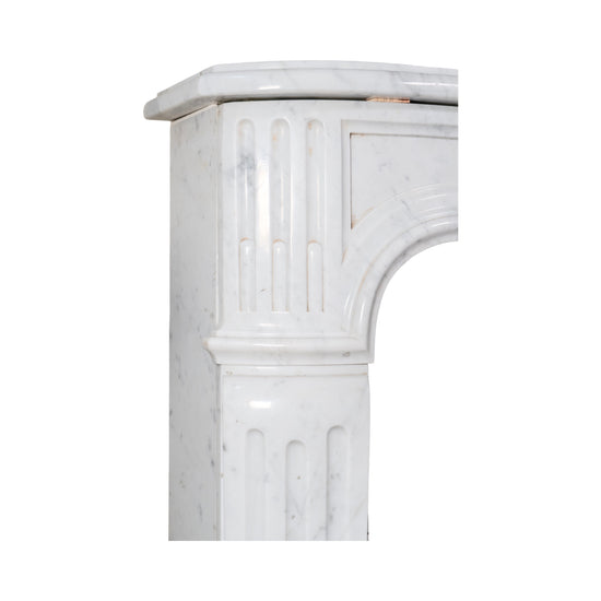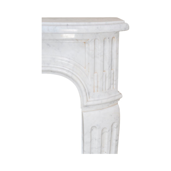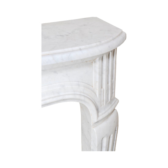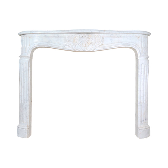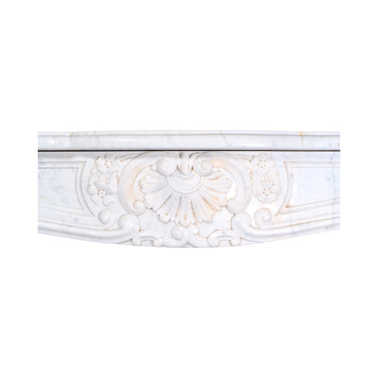 This antique 19th-century mantel from France is carved from Carrara marble and reclaimed from its original setting, carrying the character and patina that only time can give. Designed in the Louis XV style, it features a graceful serpentine front centered with a carved shell cartouche, framed by scrolling foliage and floral motifs.