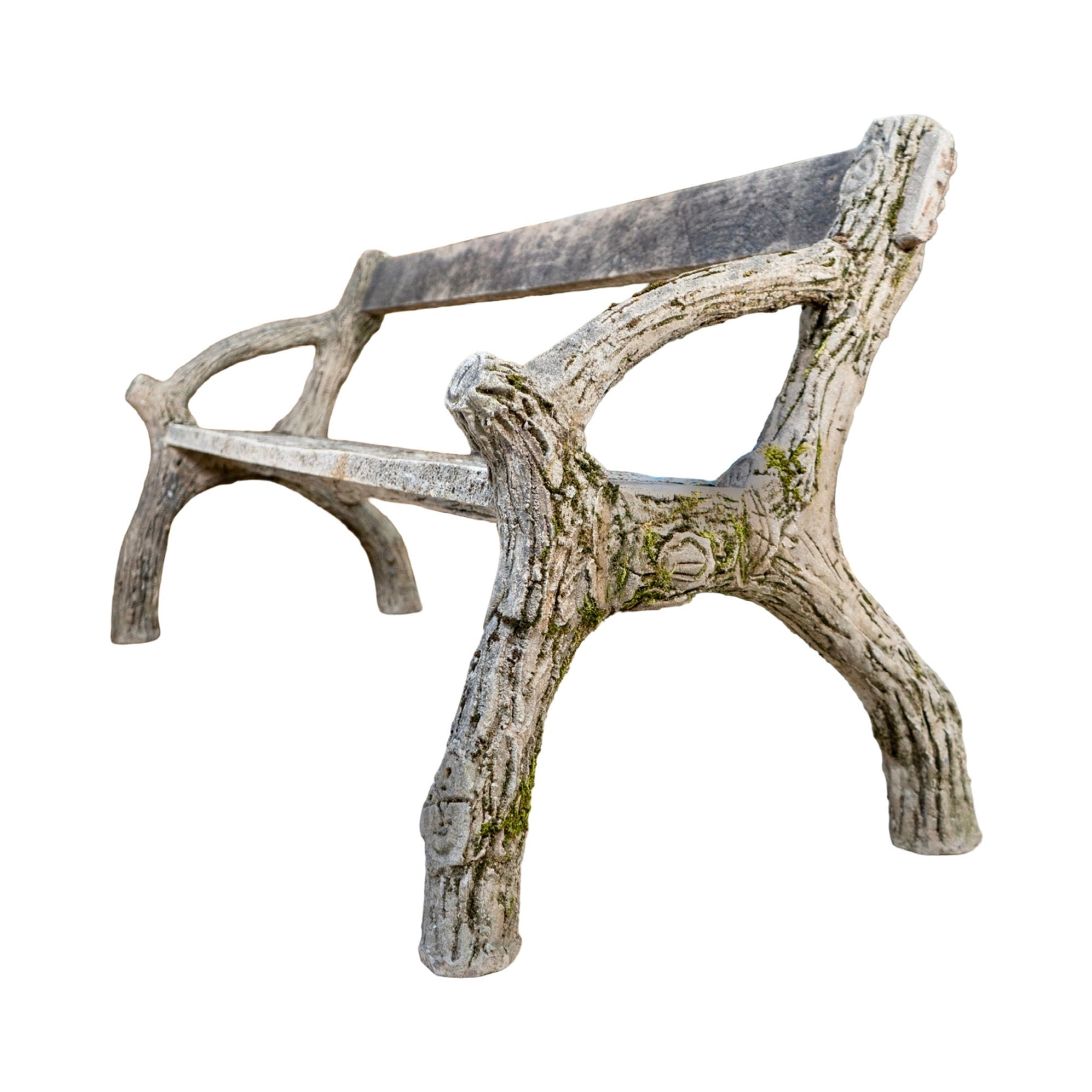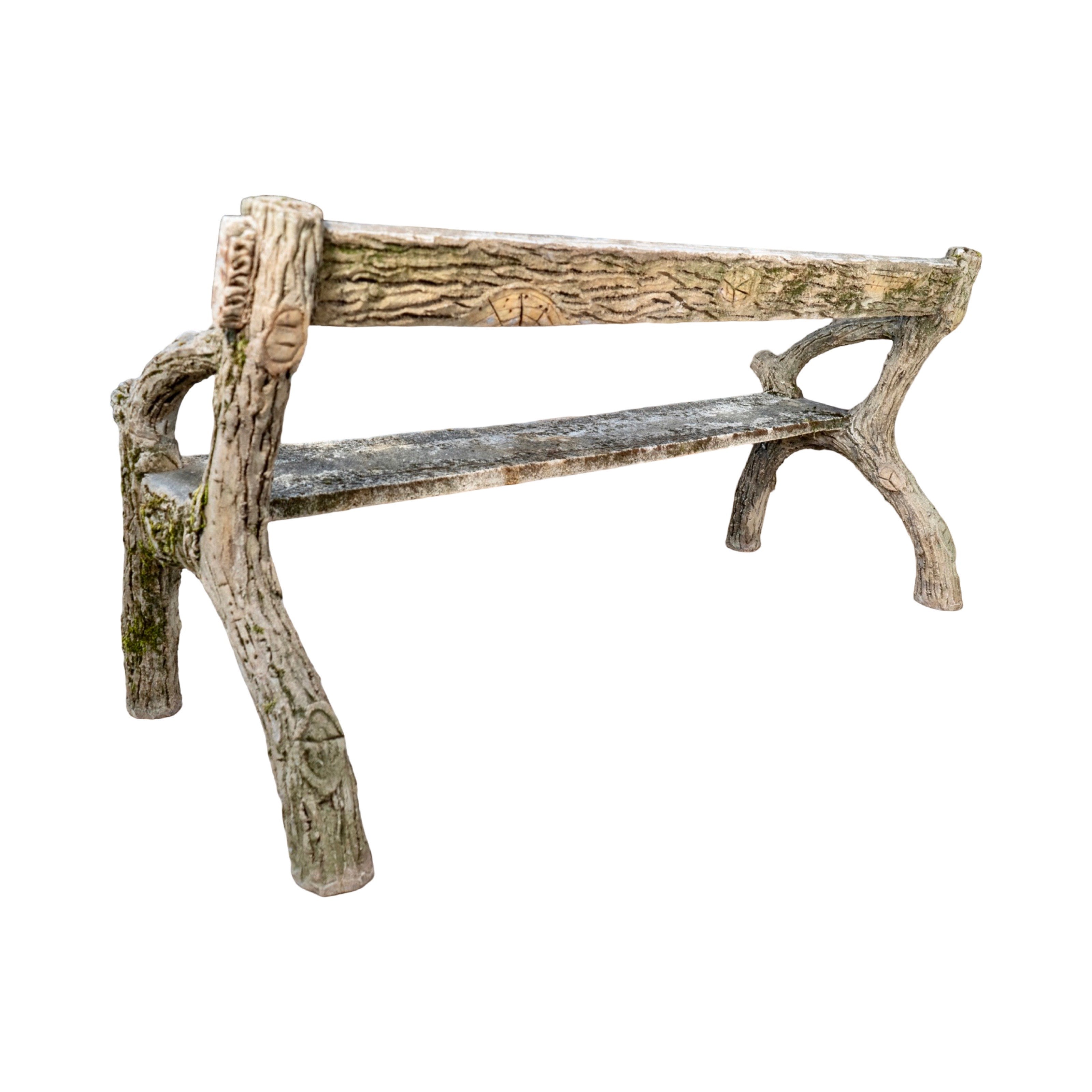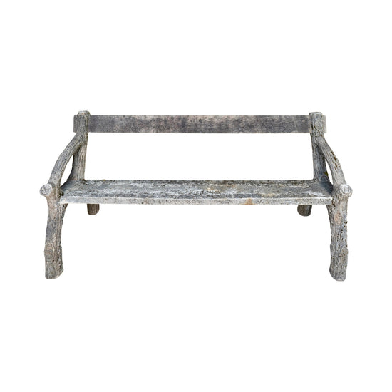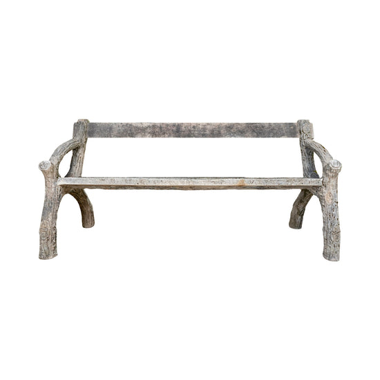 A charming example of early 20th-century faux bois craftsmanship, this garden bench captures the naturalistic beauty of hand-sculpted concrete made to resemble weathered tree branches. The entire piece—including the seat and backrest—is cast in concrete, skillfully formed to mimic the look of aged wood with bark-like textures and branch-like structure throughout.