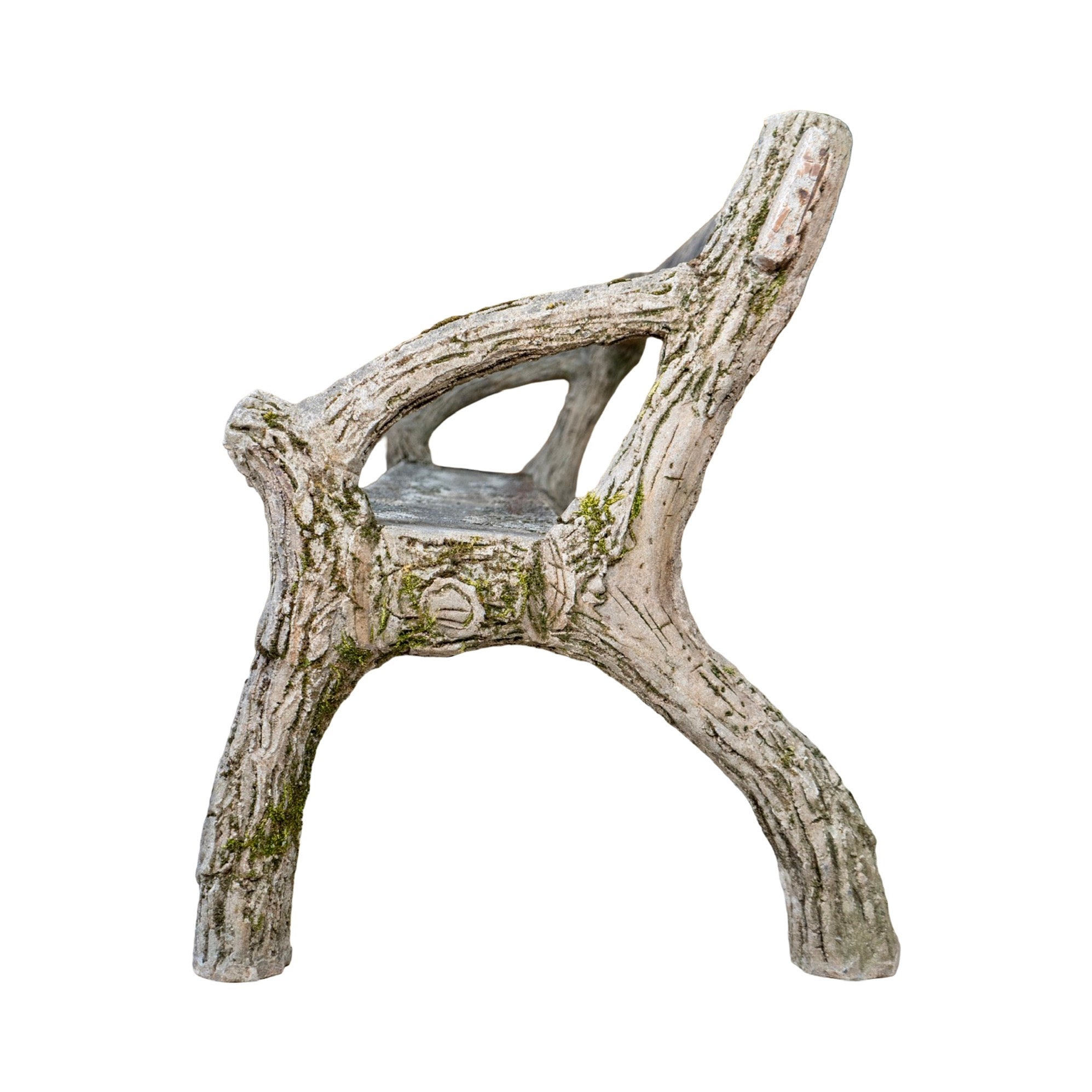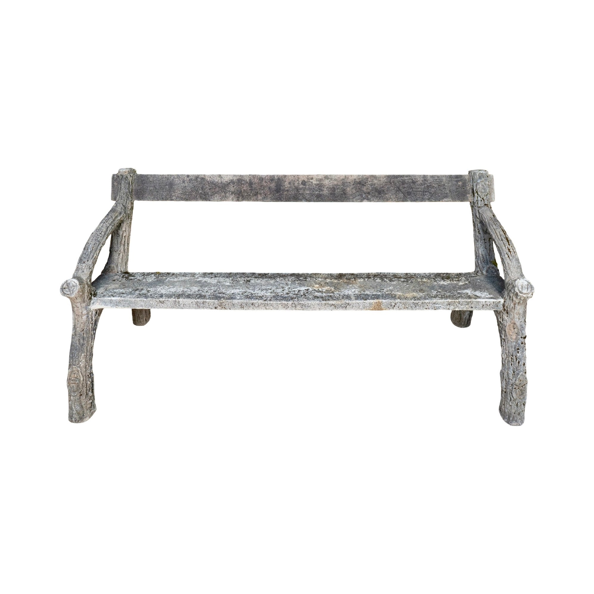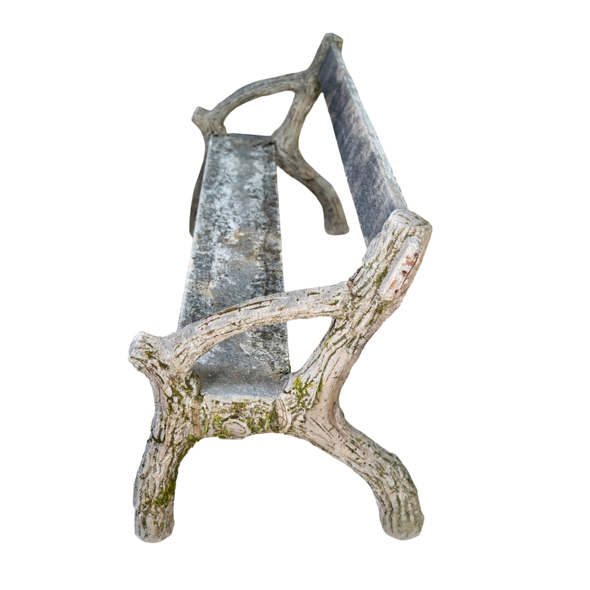 A charming example of early 20th-century faux bois craftsmanship, this garden bench captures the naturalistic beauty of hand-sculpted concrete made to resemble weathered tree branches. The entire piece—including the seat and backrest—is cast in concrete, skillfully formed to mimic the look of aged wood with bark-like textures and branch-like structure throughout.