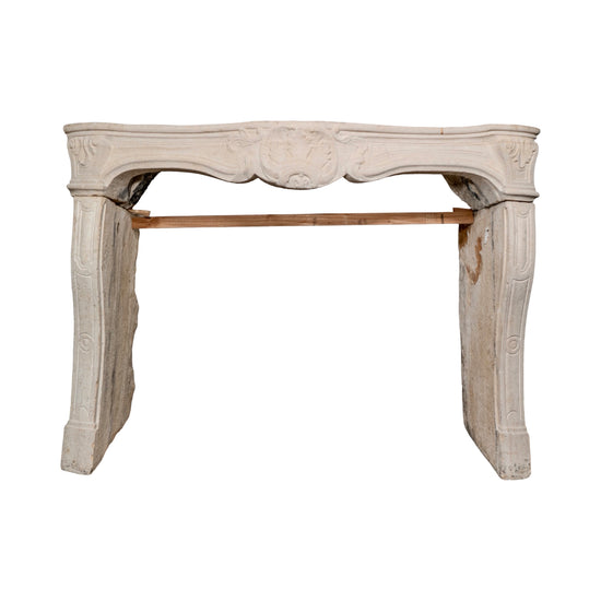 A 19th-century French limestone mantel with elegant, hand-carved detailing throughout—from the scrolling legs to the shaped apron and central crest. Antique and fully reclaimed, it carries authentic character wear, softened edges, and natural aging that give it undeniable charm. A classic French piece with beautiful lines and a refined, decorative profile.