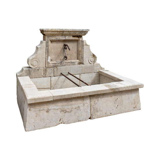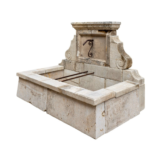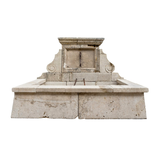 A substantial 19th-century French wall fountain carved from limestone, featuring a deep rectangular basin and a tall, architectural backplate. The fountain’s upper section showcases a recessed panel framed by classic scroll detailing and stepped moldings.