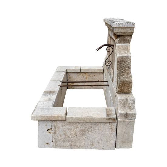 A single spout hole is centered within the panel, intended for a new spout insert. Below, two iron support rods project outward—traditionally used to hold vessels steady while filling with water. The thick stone blocks display natural aging, wear, and a soft patina that speaks to decades of outdoor exposure. Both functional and decorative, this piece serves beautifully as a garden focal point or interior water feature