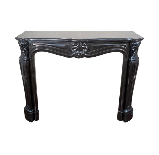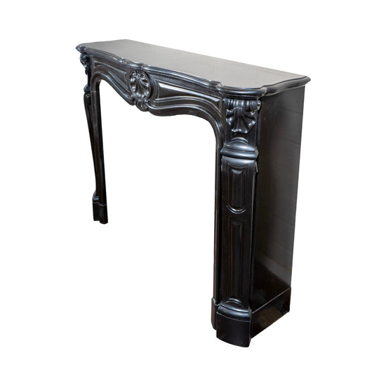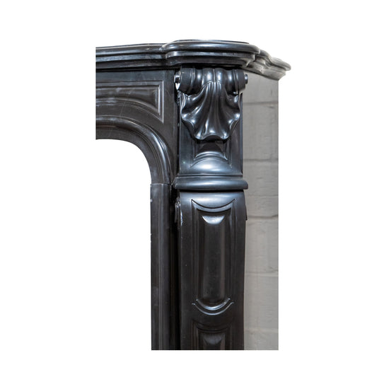 This antique and reclaimed 19th-century French mantel is carved from Noir de Mazy marble, celebrated for its deep black tone and subtle veining. The surround features elegant shell and scroll carvings, paired with shaped legs and paneled details. Refined yet bold, it brings timeless French craftsmanship into a modern setting. The polished finish enhances the marble’s natural depth, catching light across its sculpted curves. A rare piece of architectural history, it makes a striking focal point in any interior.