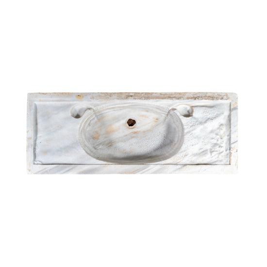 This antique, 19th century reclaimed sink from France is crafted in a wide rectangular shape from exquisite white Carrara marble. Hand-carved and featuring a central, compact basin, it includes a pre-drilled hole for effortless drainage and installation. The left and right sides provide convenient resting spots, perfect for soap bars or other useful items. Rich in character, it displays unique wear and a charming patina, adding a sense of history and elegance to any space.