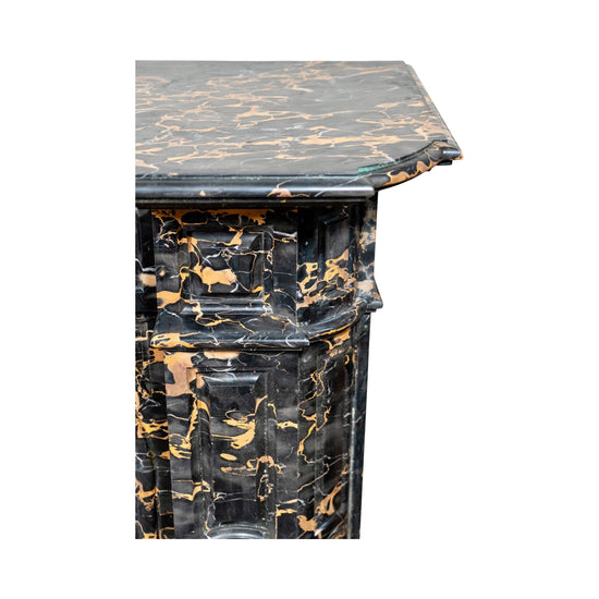 Carved in France during the 19th century, this antique and reclaimed mantel is made from Portoro marble, a rare Italian stone prized for its deep black ground laced with bold golden veining. The dramatic contrast of the stone alone makes this a statement piece, but the detailing of the carving takes it further.