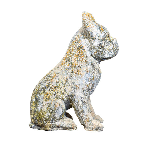 A contemporary French Bulldog statue, handcrafted in France from a reconstituted stone composite. Though small in size, its weathered finish—achieved through the composite material—adds timeless character and charm. Sold individually, these statues make a perfect accent for any outdoor setting.
