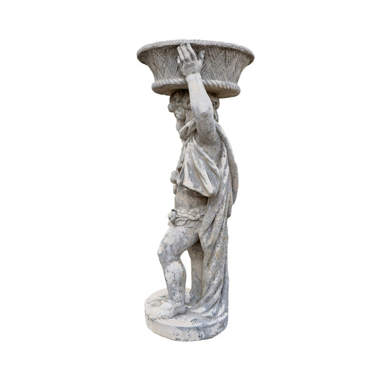 This contemporary French limestone putti sculpture planter is a beautiful addition to any garden or indoor space. The sculpture features a putti holding a basket above its head, which can be used as a planter. Made from a durable concrete composite, this 1960s piece is both a stunning work of art and a functional planter.