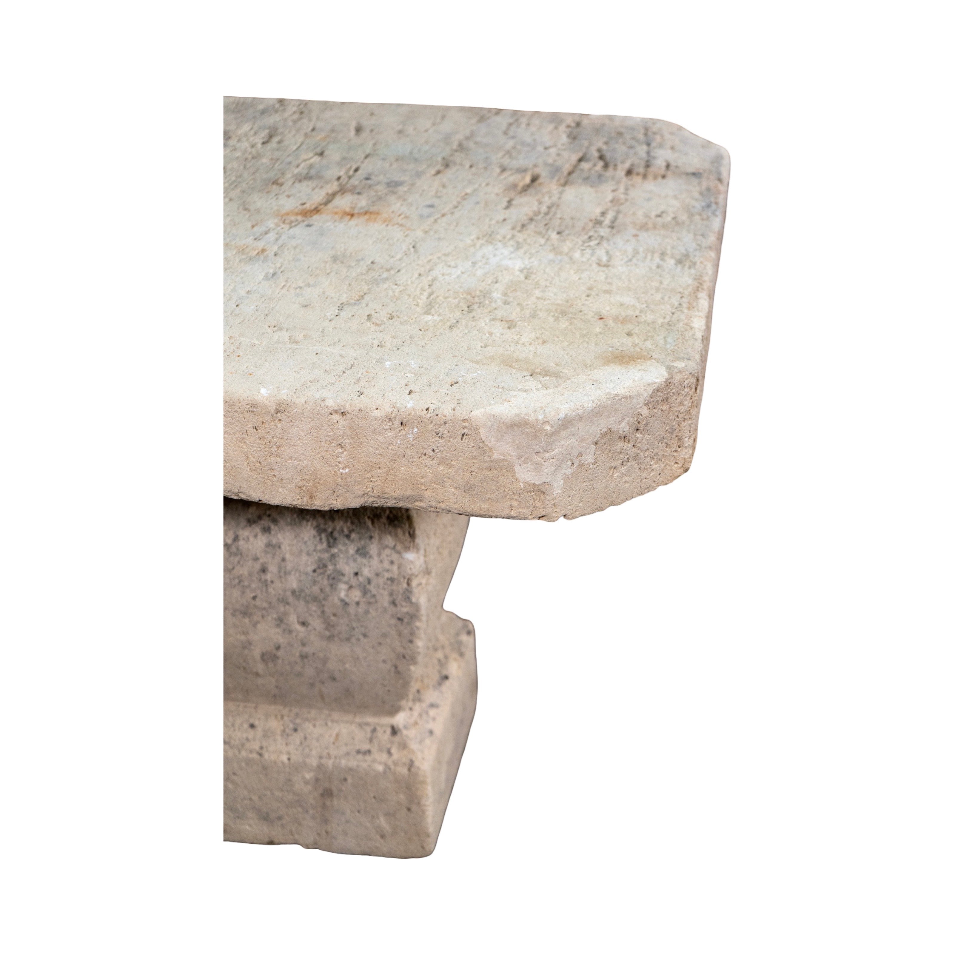 A contemporary limestone table, newly aged with subtle character. Perfect for any garden setting. The base and top are two separate pieces, coming together to form a complete, timeless table.