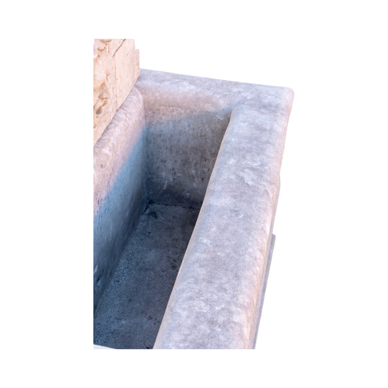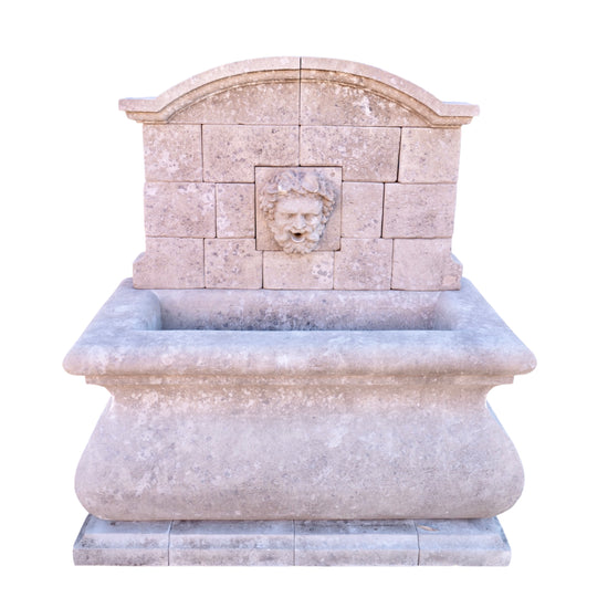 A contemporary hand-carved limestone wall fountain from France, featuring a refined blend of classical and modern design. The fountain boasts a tall, rectangular basin with elegantly curved edges, resting on a flat foundation that elevates its presence for a striking visual effect. The wall panel is crowned with a gracefully carved arched top, adding architectural depth. At its center, a meticulously sculpted Bacchus face serves as the focal point, with water flowing from its open mouth into the basin below. This exquisite fountain embodies timeless elegance, making it a sophisticated addition to any space.