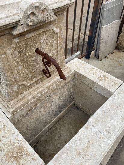 An antique French limestone wall fountain, hand-carved and dating to the early 1900s. This elegant piece features a medium-sized basin for water overflow, with a pre-drilled hole for water spout inserts. The backplate showcases a classic bolection-style carving in the center, accented by a floral motif at the top for added charm and character.
