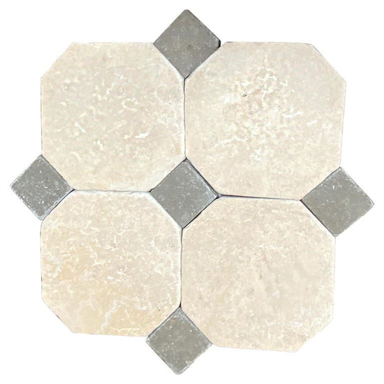 This Octagonal Tile Mosaic is made up of limestone octagonal pieces (STONE-GIMF) and smaller cabochon tiles (STONE-BGDQ) to create a stunning flooring design.