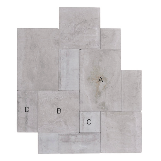 This limestone flooring is finished with a sandblasted surface and laid in a traditional opus pattern, composed of four different tile sizes that interlock to create a dynamic, rhythmic layout. The pattern introduces movement and visual interest while remaining balanced and architectural.