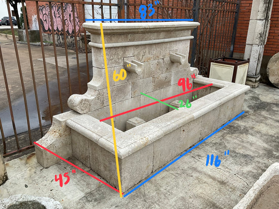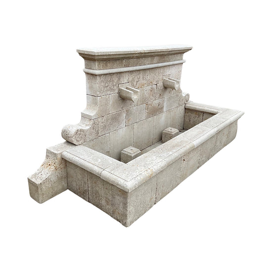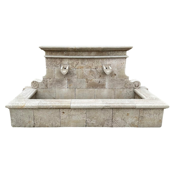 A wide, hand-carved rectangular limestone fountain from France, contemporary made. Featuring dual central water spouts and an expansive basin, this fountain is adorned with elegant scroll carvings along the sides and extending down to the base.