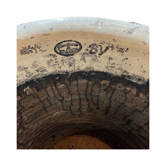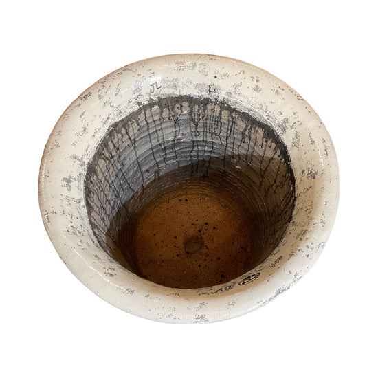 This Contemporary French Glazed Terracotta Planter embodies the distinctive Art Deco style of the 1930s. Expertly handmade using the rope thrown technique, it features terracotta construction with an ivory glaze that imparts a weathered, patinated finish. The aged appearance enhances its vintage charm, making it a sophisticated and authentic addition to any architectural or interior design project.