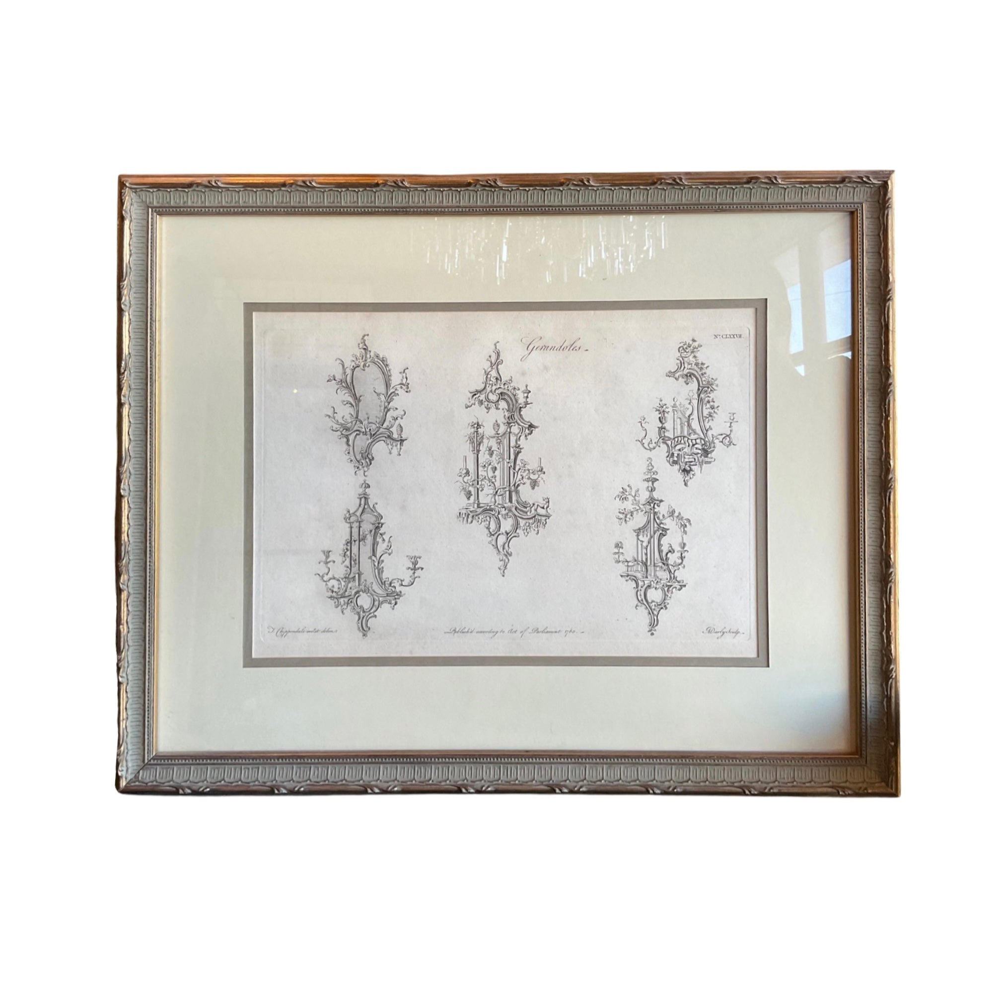 Framed Architectural sketch print of Girandoles. Circa, 17th century. Originates from France. Signed and dated.
