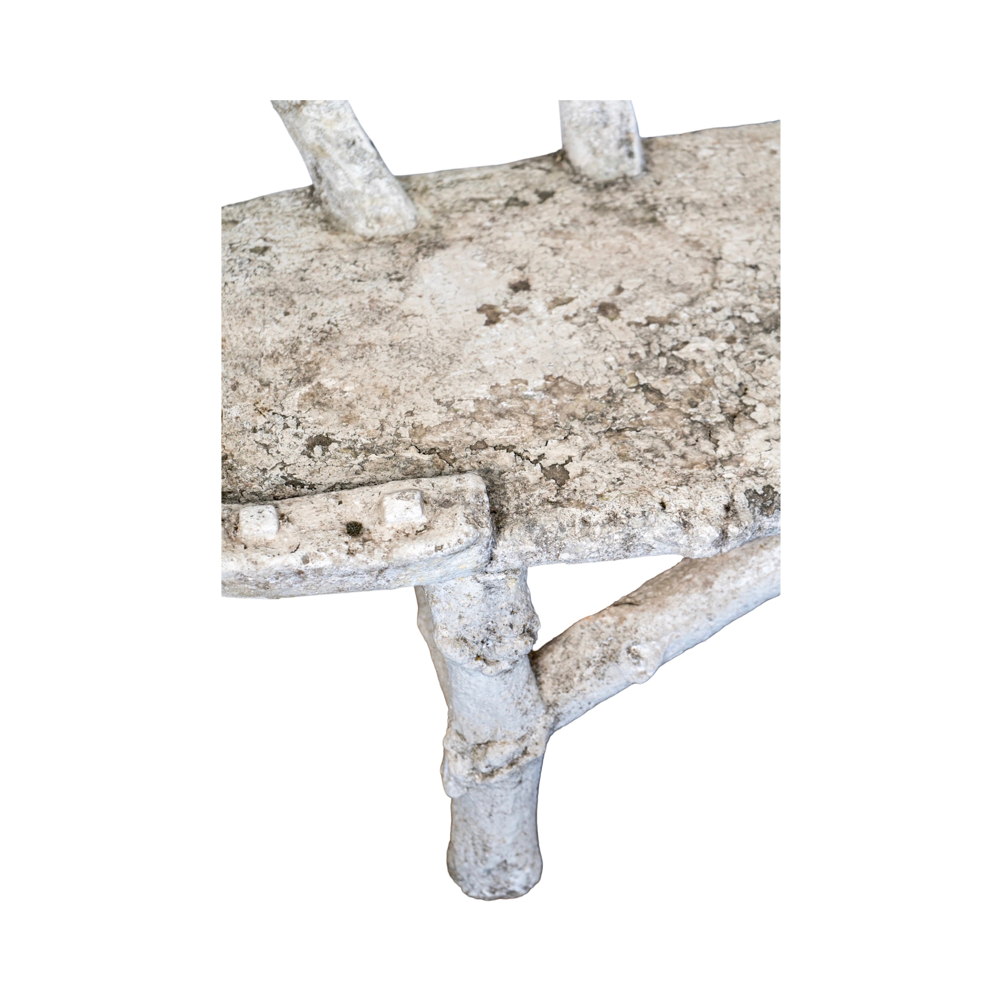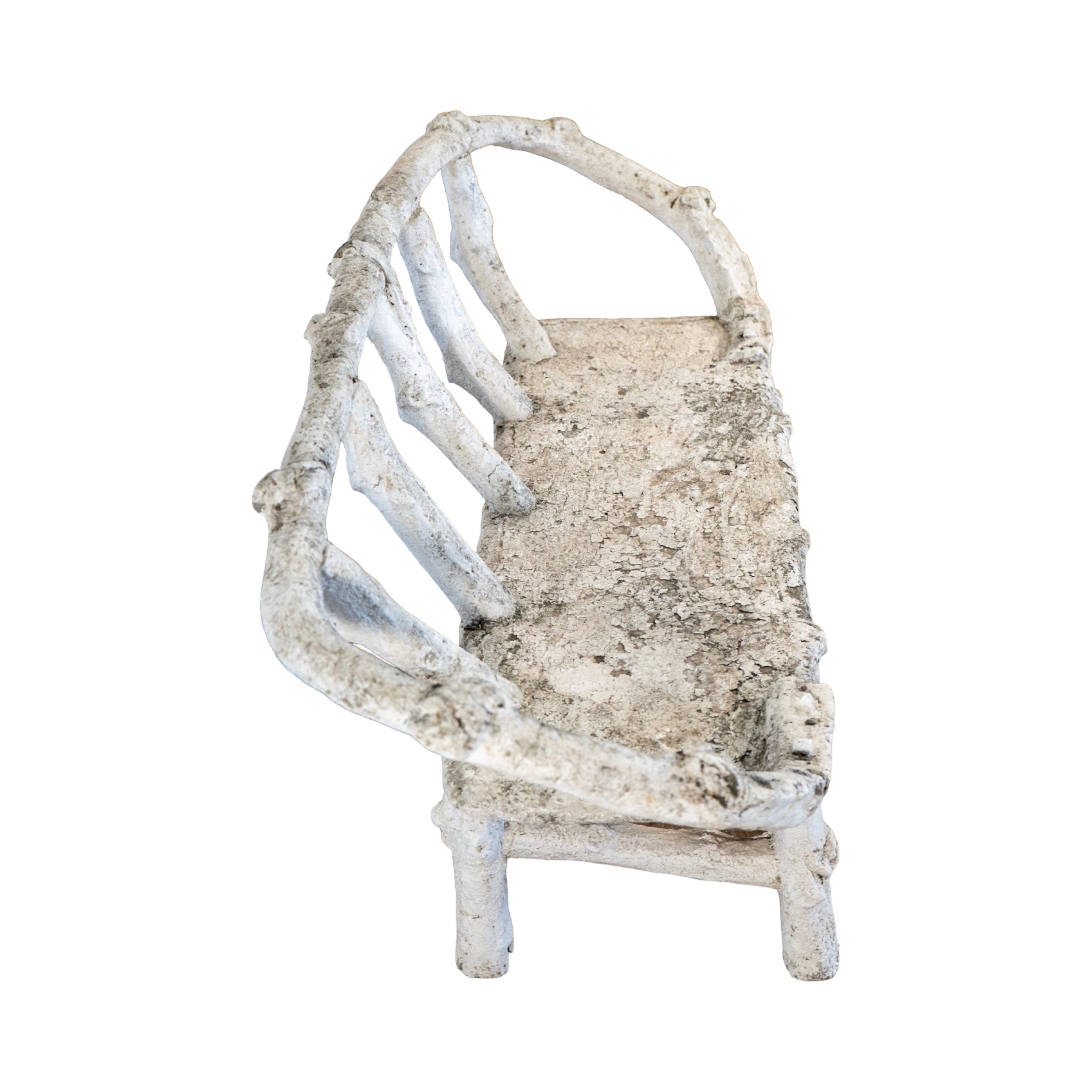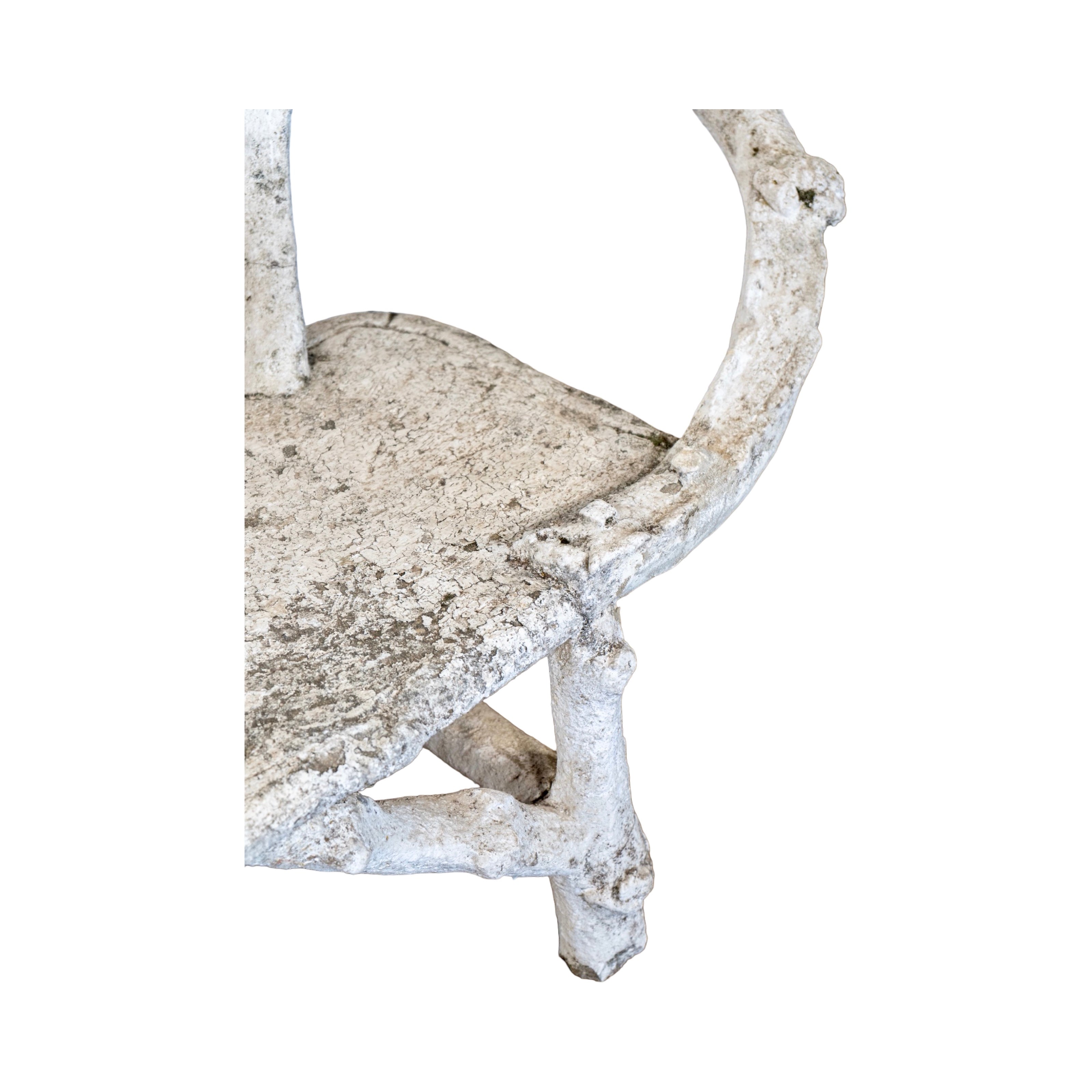 Crafted in France during the 19th century, this faux bois bench captures the look of hand-carved branches in a sculptural, organic form. The piece has been fully cleaned, revealing the raw faux-wood texture beneath a soft white-wash finish that highlights every knot, curve, and branch-like detail. Its gently rounded back and twig-inspired frame give it a charming, natural feel, while the aged surface and subtle patina add authenticity and character. A beautiful, sculptural garden piece with timeless French charm.