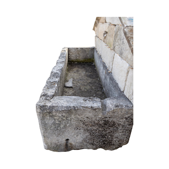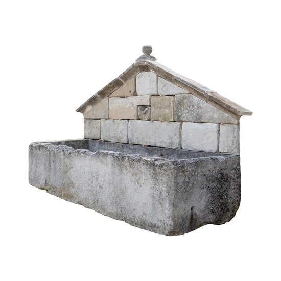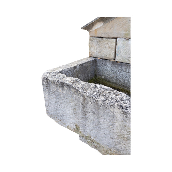 This antique French wall fountain, crafted from limestone, evokes a peaceful, classical ambiance. Its arched top and wide rectangular basin create a graceful water overflow, while the separate archway and trough make assembly straightforward. With natural aged wear throughout, this piece brings the charm of 17th-century France to any setting.