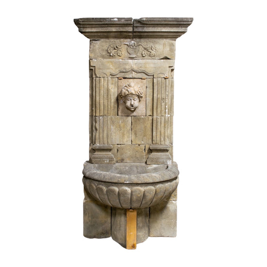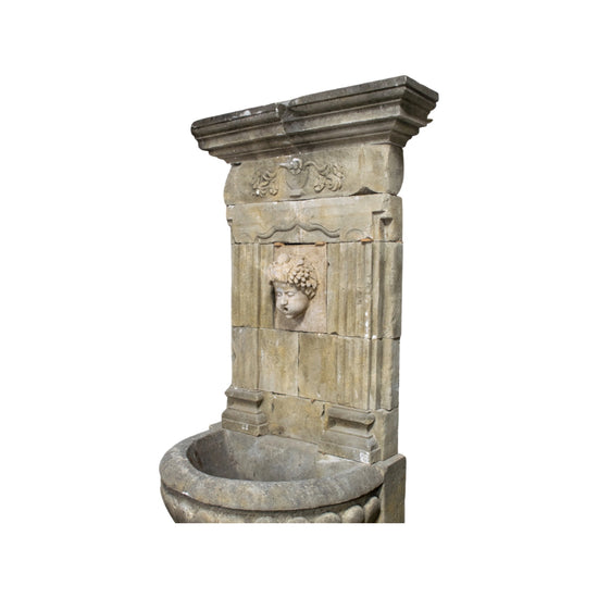 A 19th-century French wall fountain, hand-carved from limestone and adorned with intricate details. This antique fountain features a central Bacchus face that serves as a water spout, directing the flow into a small basin below. At the top, a beautifully carved vase with floral motifs adds an elegant touch, while the aged wear throughout enhances its authentic charm.