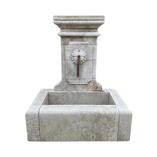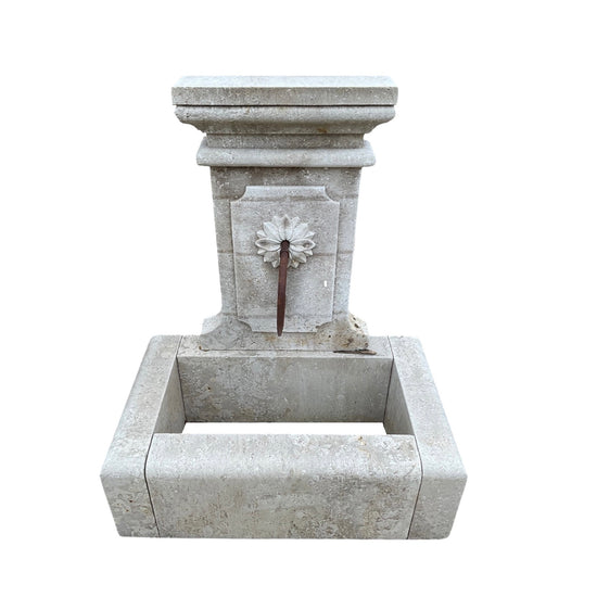 This French limestone wall fountain, originating from the 1960s, features a small rectangular low-line shape basin at the bottom center. An intricate floral motif at the center top for the water spout exit. Comes with one water spout. The perfect addition to any outdoor space, this fountain brings a touch of French elegance and charm while providing a peaceful water feature. Crafted from high-quality limestone, it is built to last and will enhance the aesthetic of any wall it adorns.