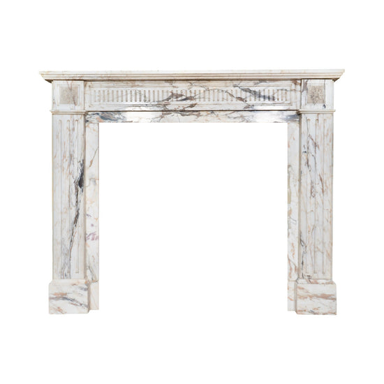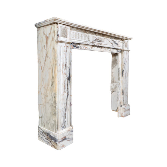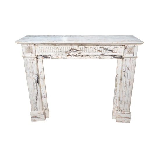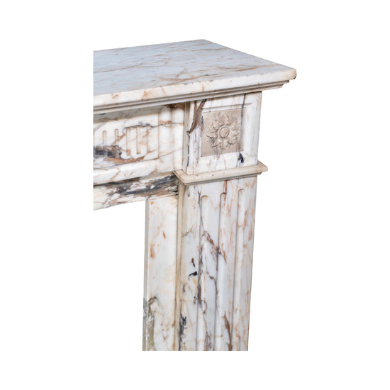 The design is classical and well-proportioned, with fluted jambs, a paneled frieze detailed with linear carvings, and rosette blocks at each corner. The combination of refined Italian craftsmanship and the natural beauty of Arabescato Corchia makes this mantel a standout focal point in any interior.