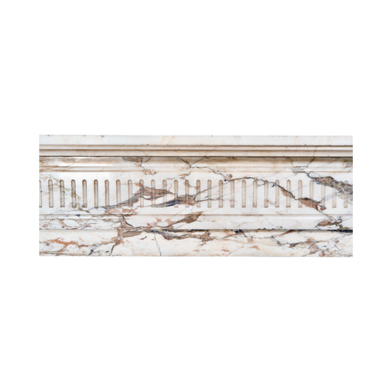 This 19th-century mantel from Italy is carved from Arabescato Corchia marble, a prized Italian stone celebrated for its dramatic veining. The marble features a creamy white base accented with bold swirls of warm grey, gold, and earthy undertones, creating a surface rich with movement and character.