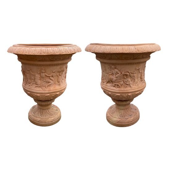 Crafted in Italy in the 20th century, this substantial terracotta urn features intricate detailing throughout—from the fluted lip and acanthus leaf base to the richly ornamented body. The central band showcases a finely carved classical scene in high relief, depicting a mythological marine procession with gods, hippocamps, and tritons—an homage to ancient Greco-Roman imagery often associated with Neptune and Bacchic rituals.