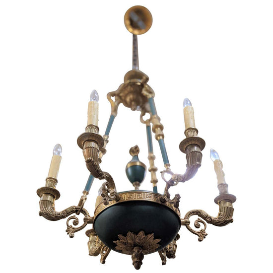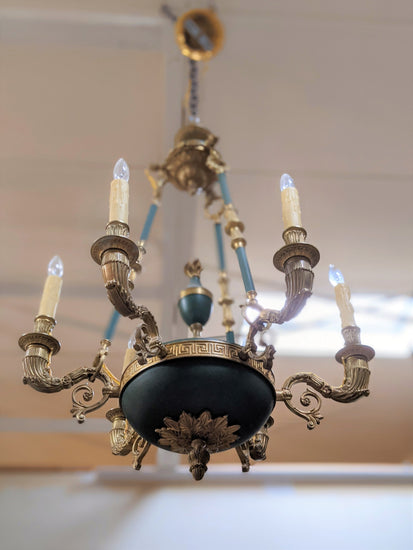 This bronze chandelier is Empire style and origins from France. 6 lights. 19th century period.