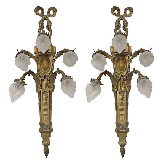 Pair of early 20th-century Louis XVI sconces are in a bronze finish with ten frosted flame glass globes. Originates from France, 20th century. Sold as a set.