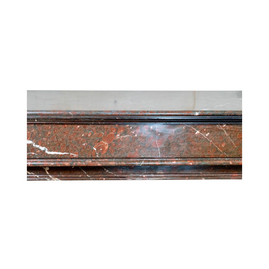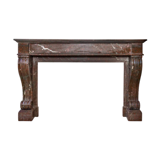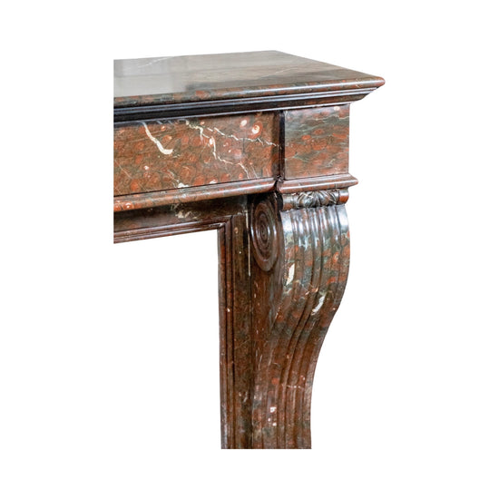 This elegant French Marble Mantel is an antique piece, originating from France circa 1820. Crafted from Red Griottee marble, this late Empire carved mantel features a generous S-scroll fluted pediment, and is supported by square block feet. A beautiful addition to any home or space, bringing a touch of elegance and history.