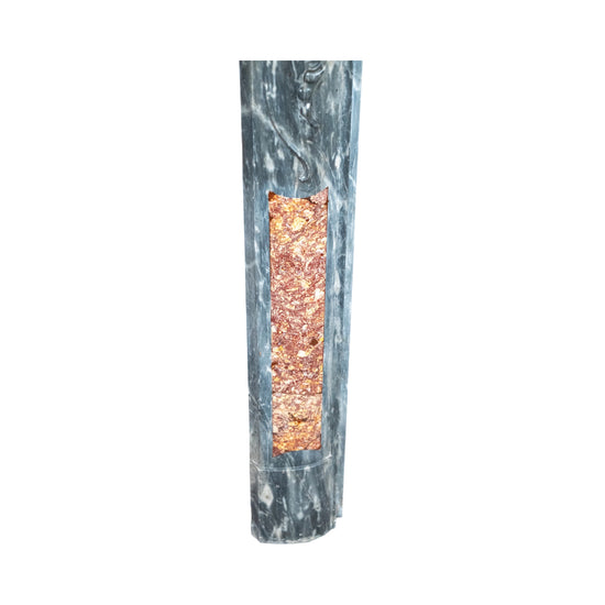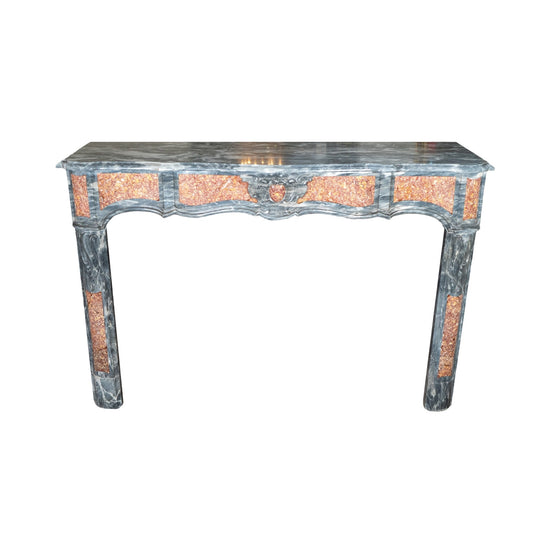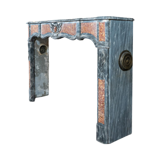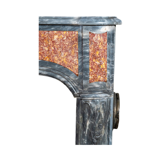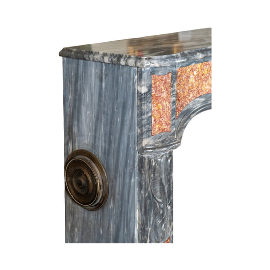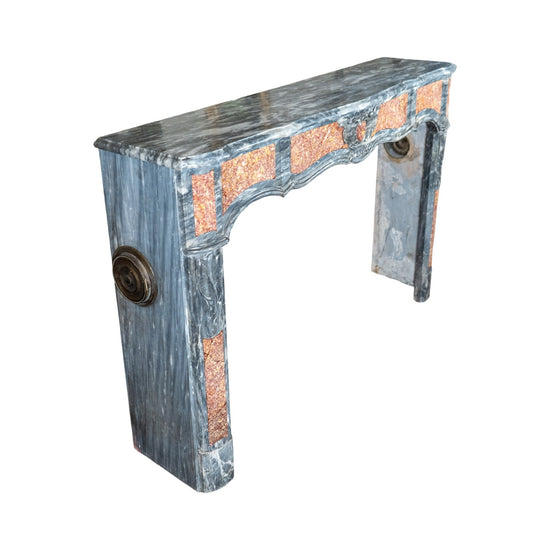 A remarkable Louis XVI-style marble mantel from 1780s France, meticulously crafted from Turquin Blue and Violet Brocatelle marble. This reclaimed antique showcases exquisite design, featuring striking Brocatelle marble accents framed by the elegant Turquin marble. The mantel is adorned with an intricately hand-carved keystone, exemplifying the refined artistry of the era. Functional air vents discreetly incorporated into the mantel legs provide ventilation while preserving its historic elegance.