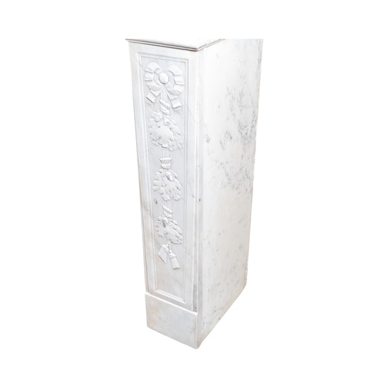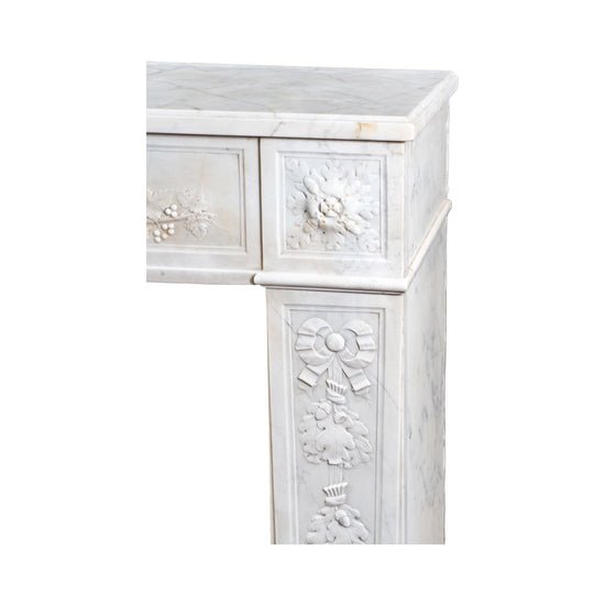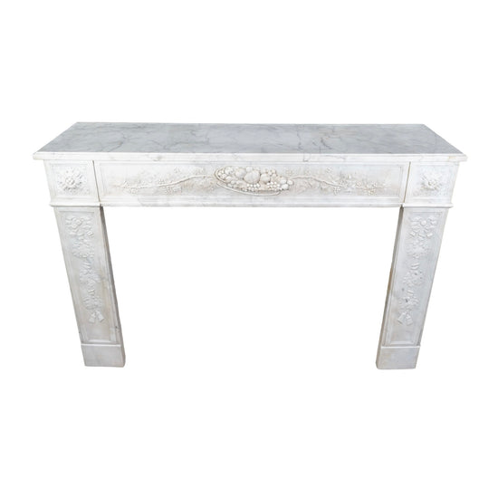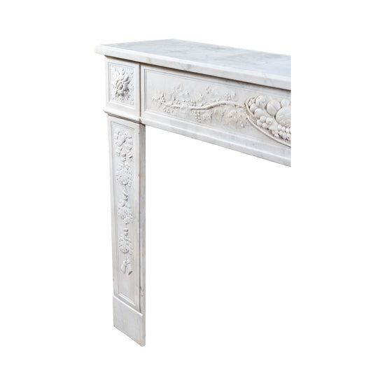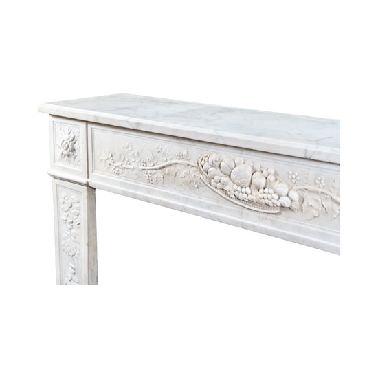 Expertly crafted in Bordeaux, France in the 1820s, this white veined Carrara marble mantel exudes timeless elegance. Featuring a beautifully carved fruit bowl in the center and intricate floral motifs on its legs, it will add a touch of sophistication to any space. Bring the beauty of French craftsmanship into your home.