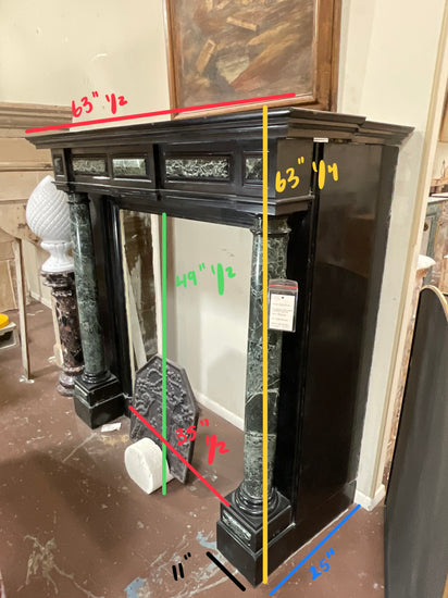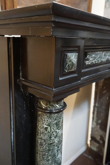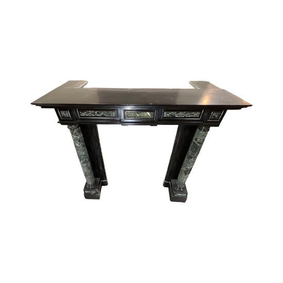 This distinguished 19th-century fireplace mantel, crafted in the Napoleon III style, originates from Belgium and embodies timeless elegance. Featuring a grand columned design, it boasts dual columns on each side, creating a stately, enclosed effect. The columns are sculpted from rich Maurin Green marble, beautifully contrasting the mantel’s main body, which is fashioned from deep Mazy Black marble. At its center, three framed panels of Maurin Green marble add a sophisticated touch, lending depth and harmony to this historic and architectural masterpiece.