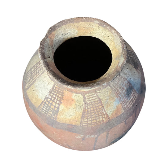This one-of-a-kind North African terracotta vessel is an antique piece with a round base holder attached for secure support. Its faded and discolored African-style design patterns are sure to make it an eye-catching and unique addition to any collection. Crafted almost 200 years ago in the mid-1800s, this terracotta vessel is a true work of art.