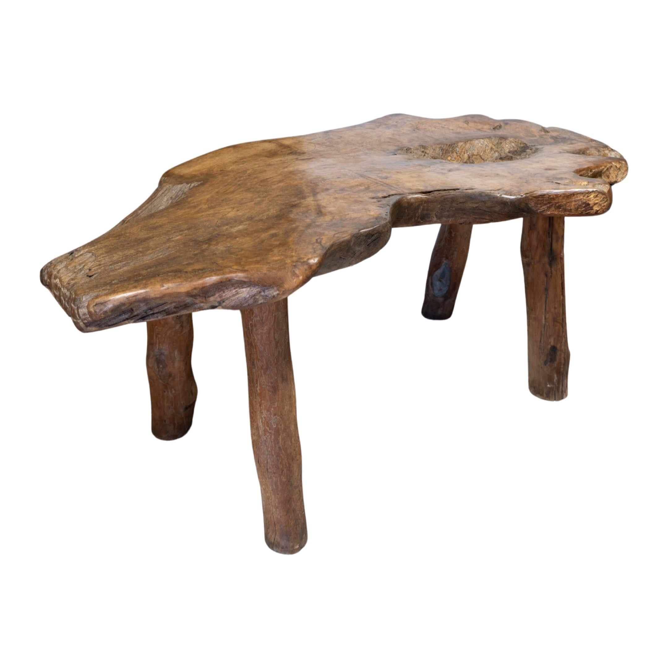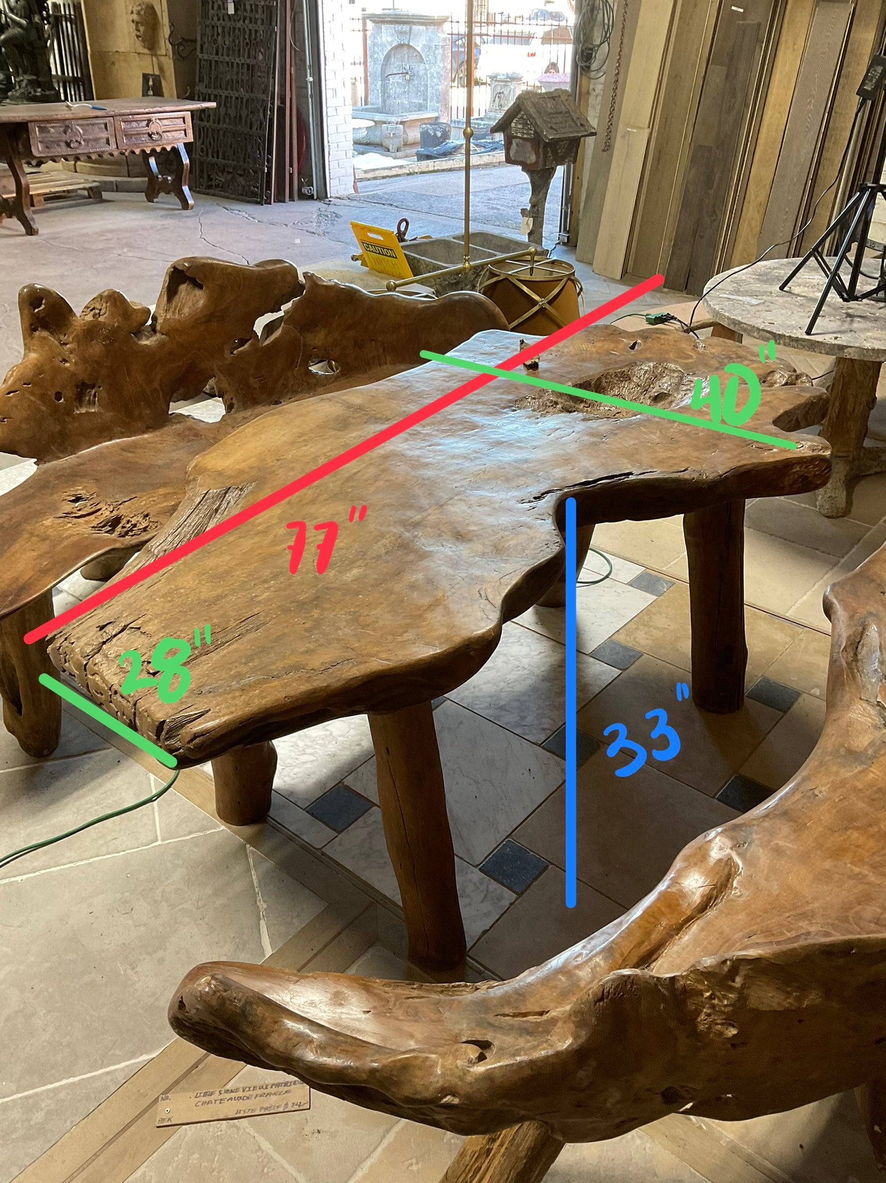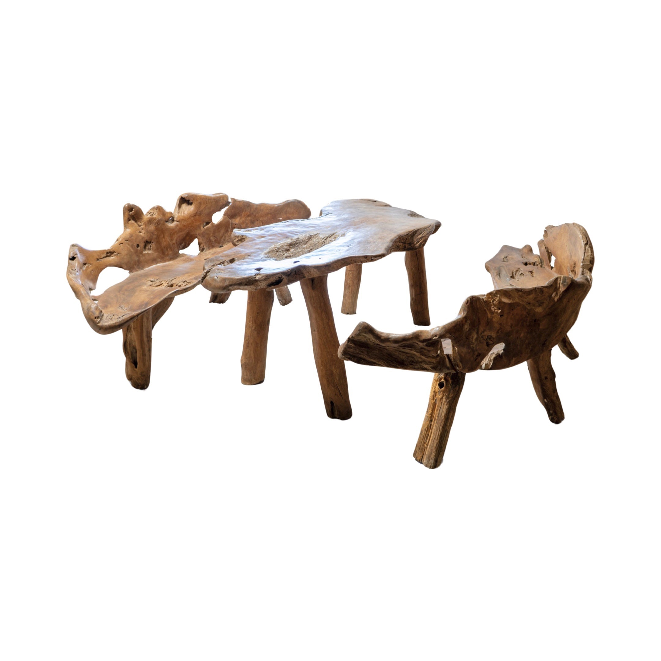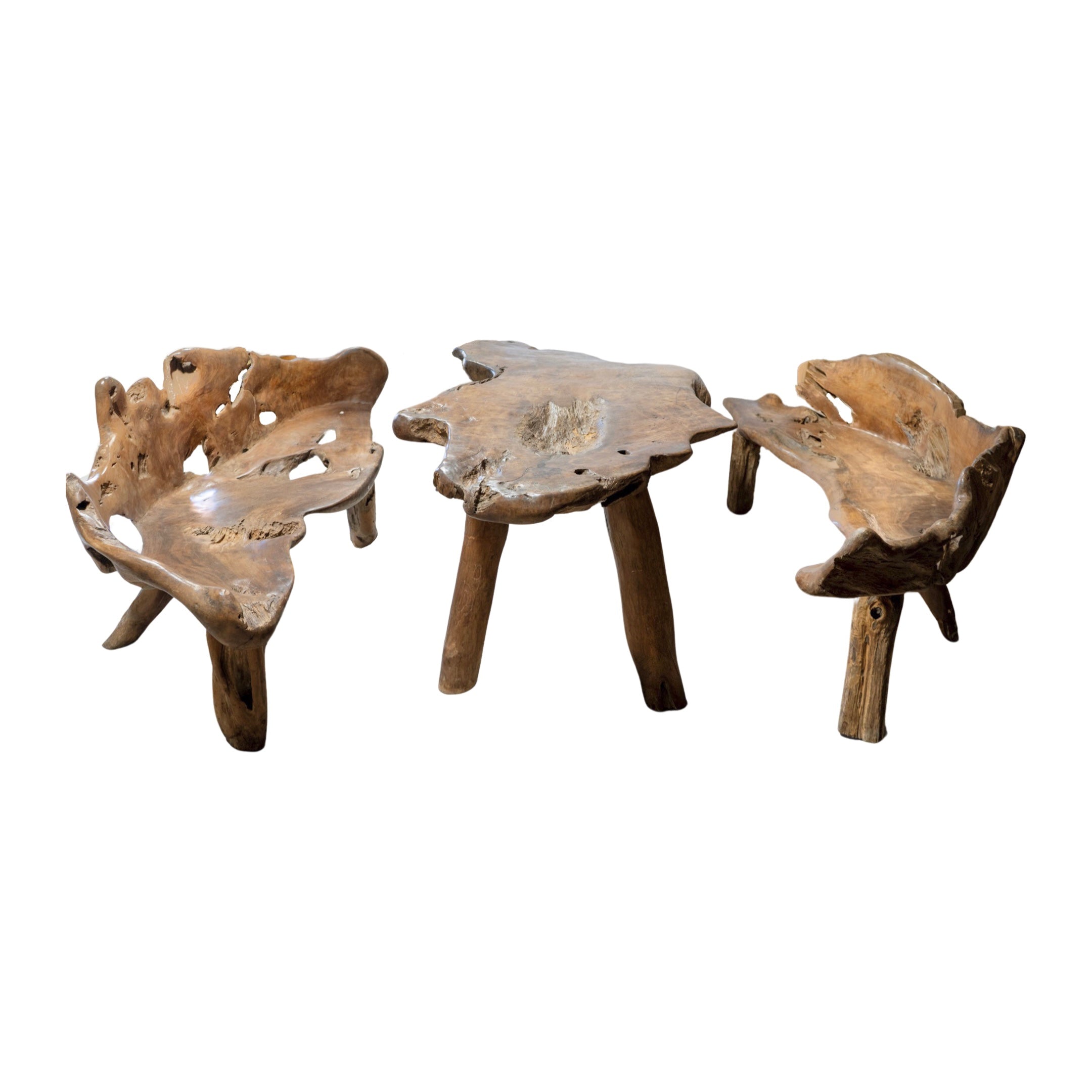 This unique garden table set is crafted from a 19th century French olive tree, providing a one-of-a-kind piece for any outdoor or indoor space. The set includes a table and two wide bench-style chairs, perfect for creating an earthy and inviting atmosphere. Made with natural olive wood, this set is both beautiful and durable.