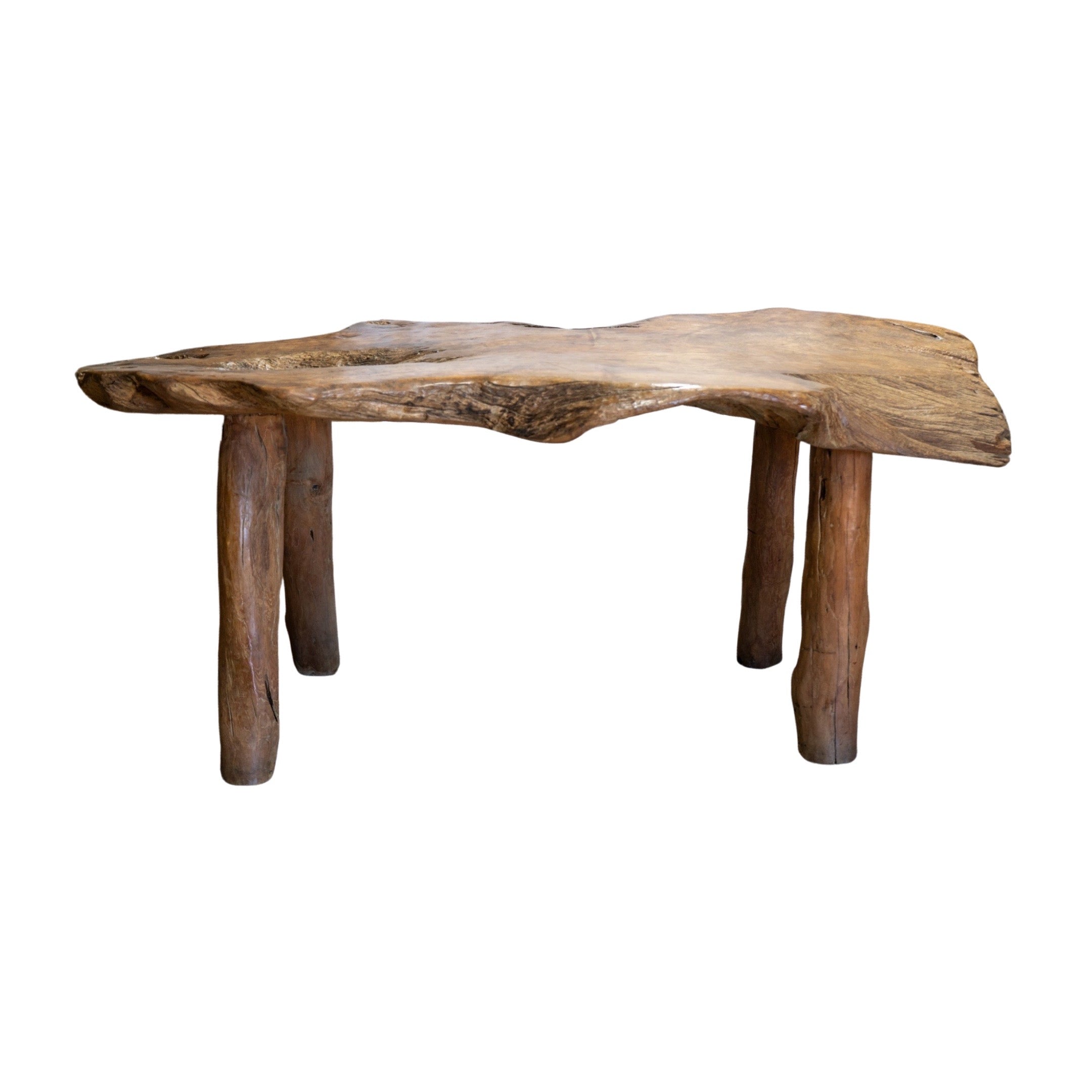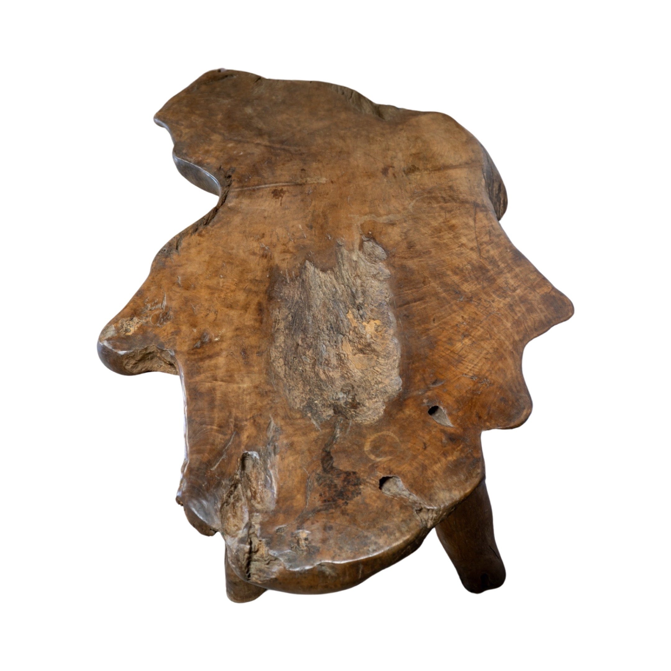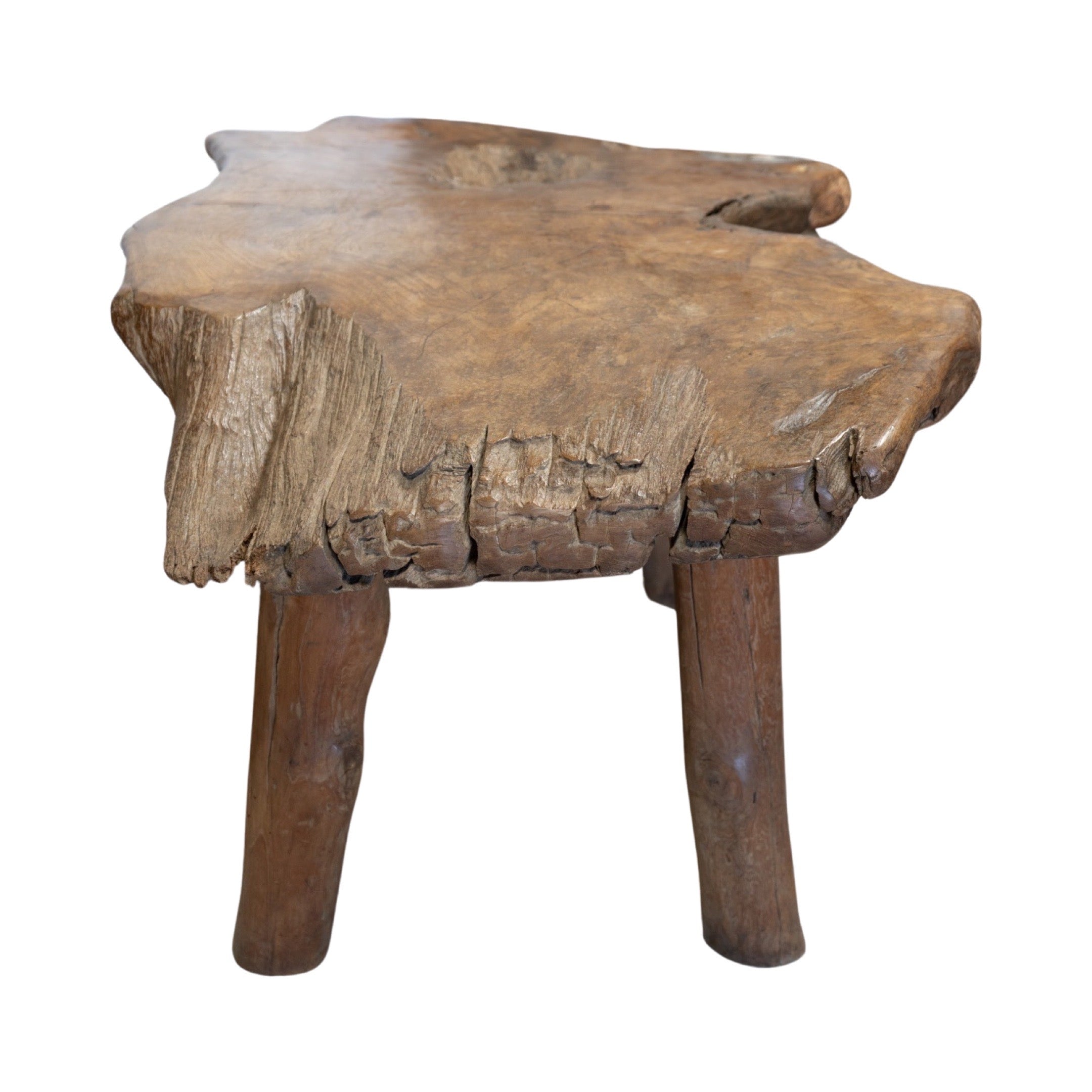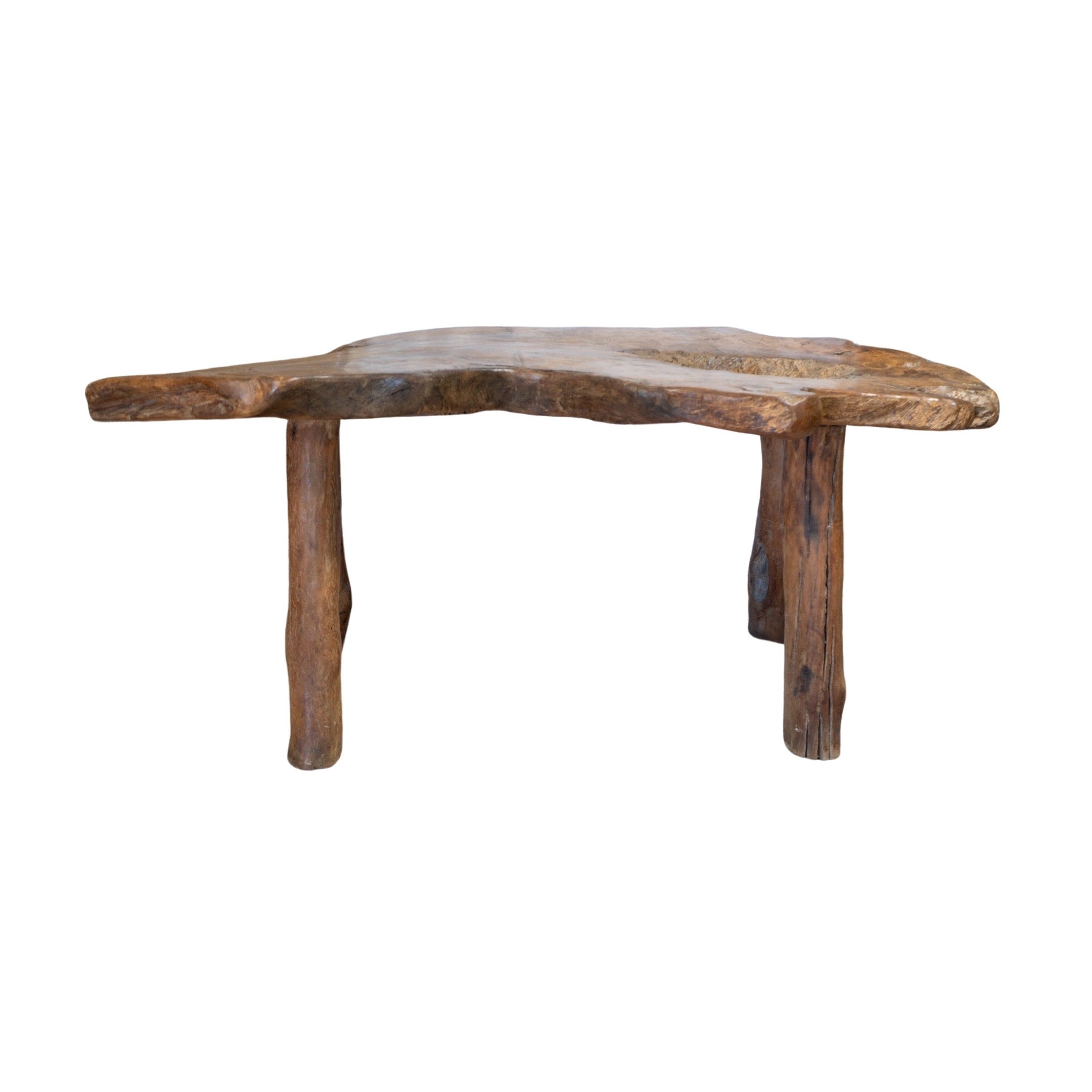 This unique garden table set is crafted from a 19th century French olive tree, providing a one-of-a-kind piece for any outdoor or indoor space. The set includes a table and two wide bench-style chairs, perfect for creating an earthy and inviting atmosphere. Made with natural olive wood, this set is both beautiful and durable.