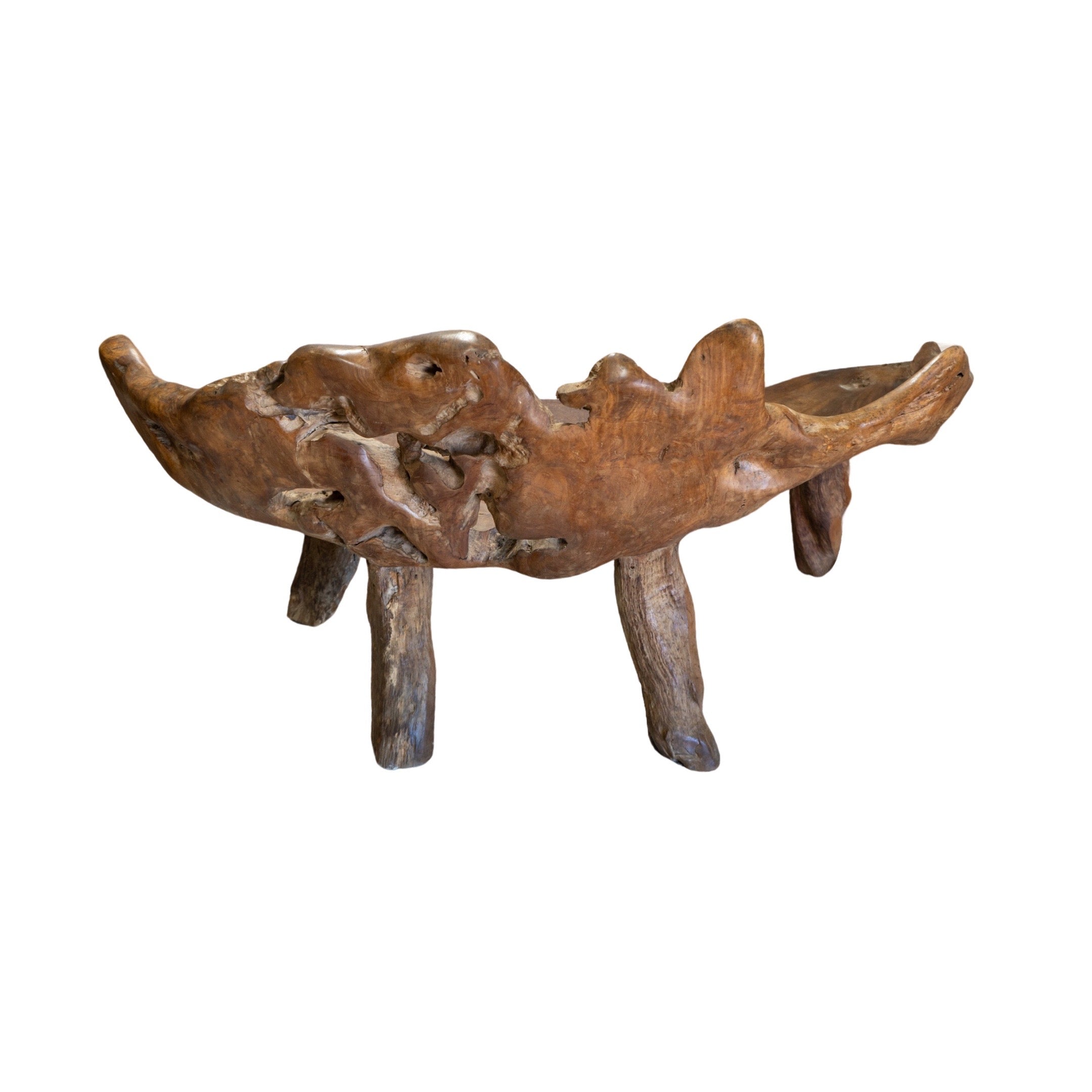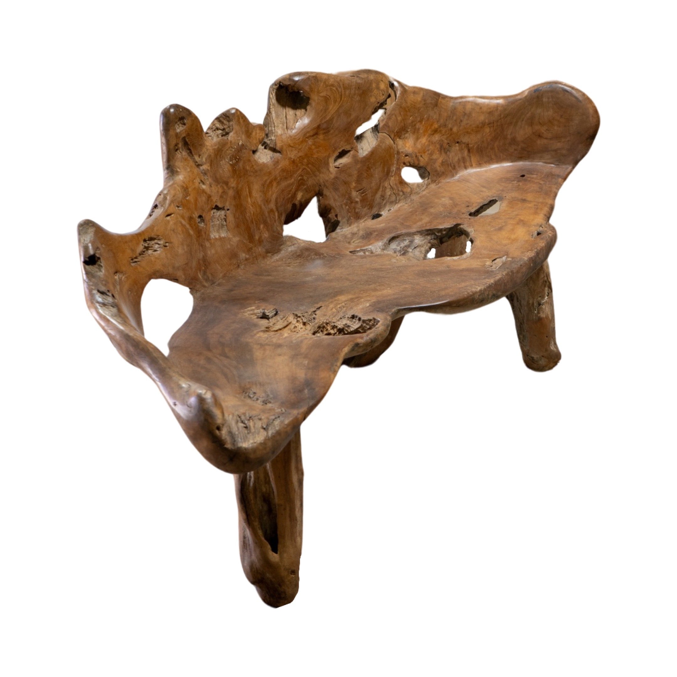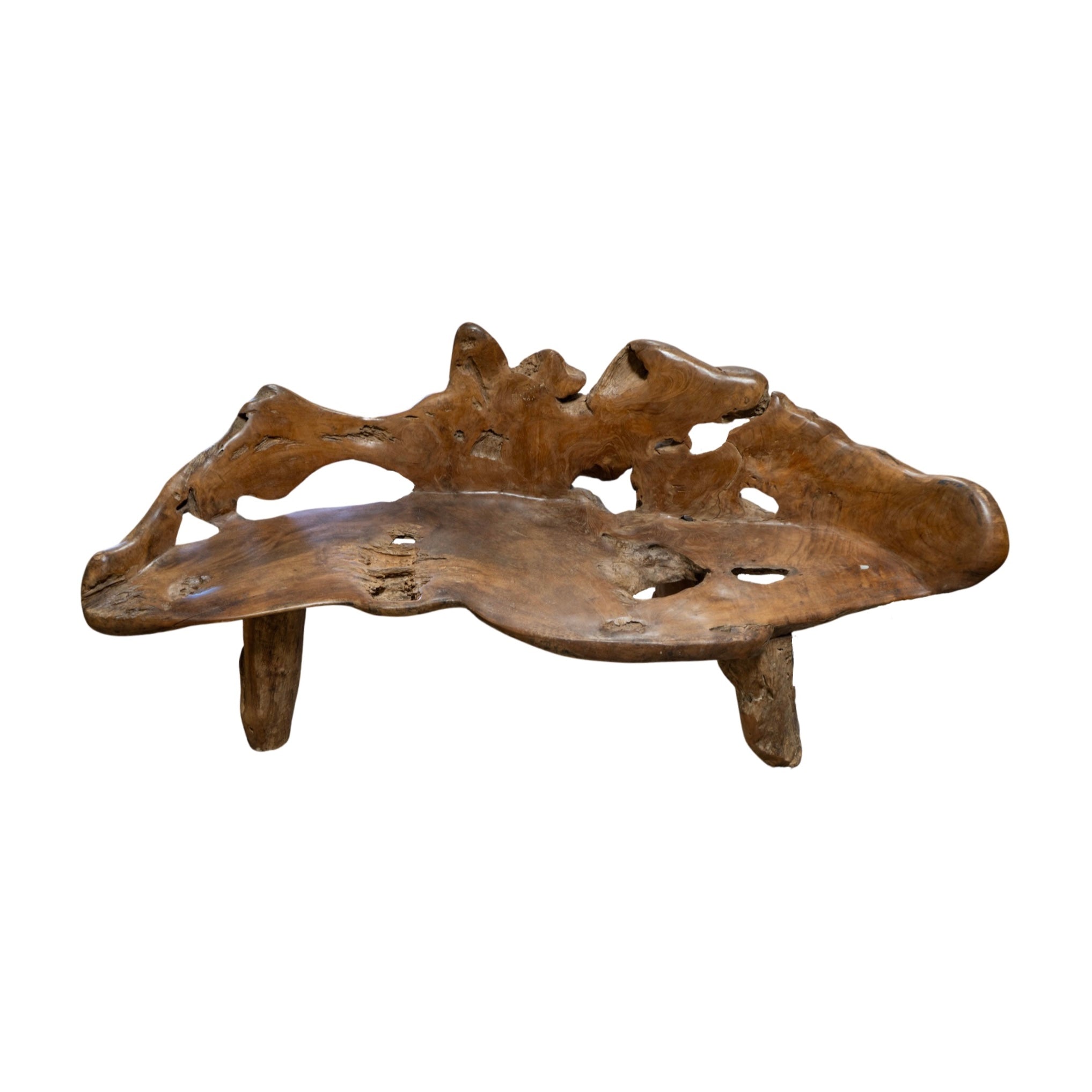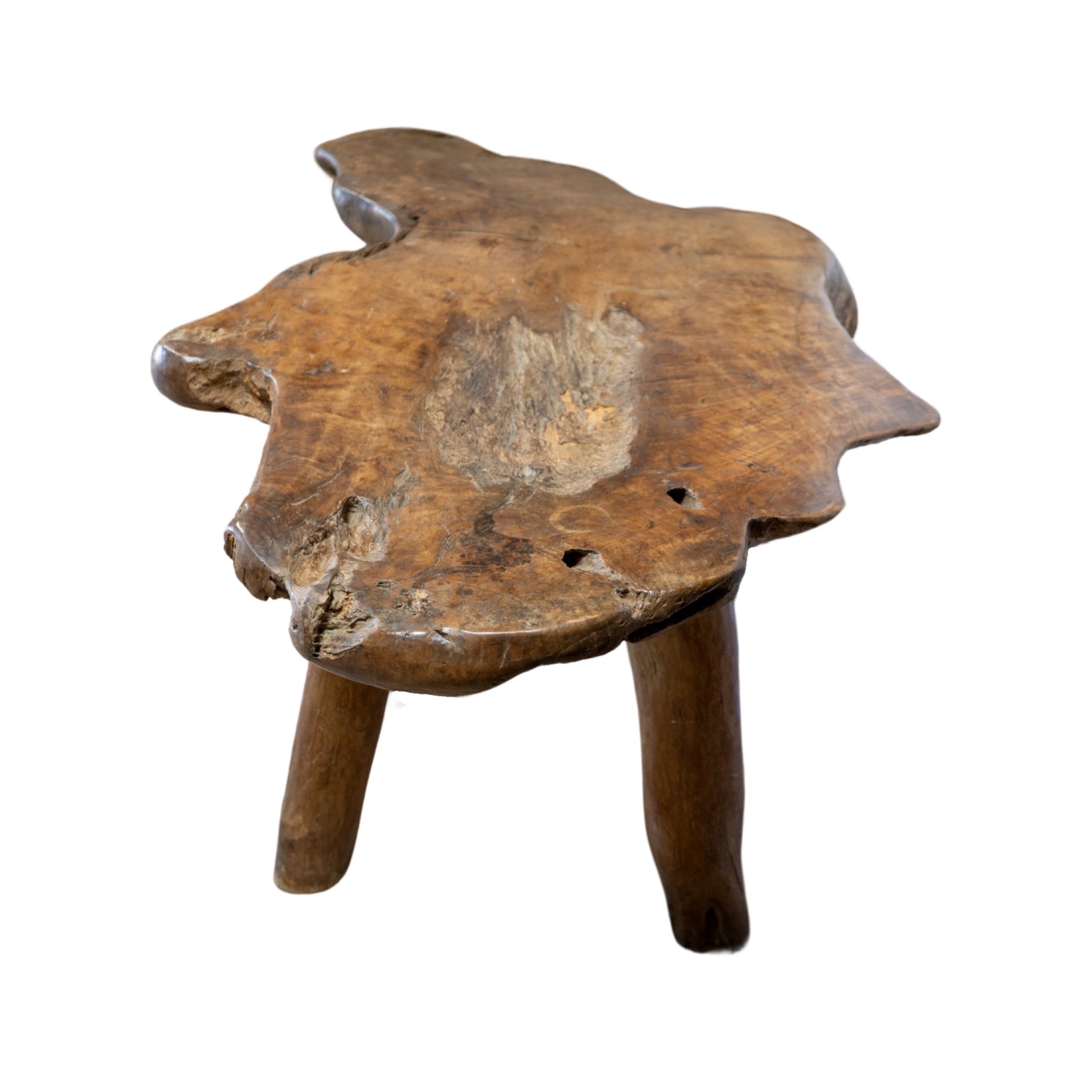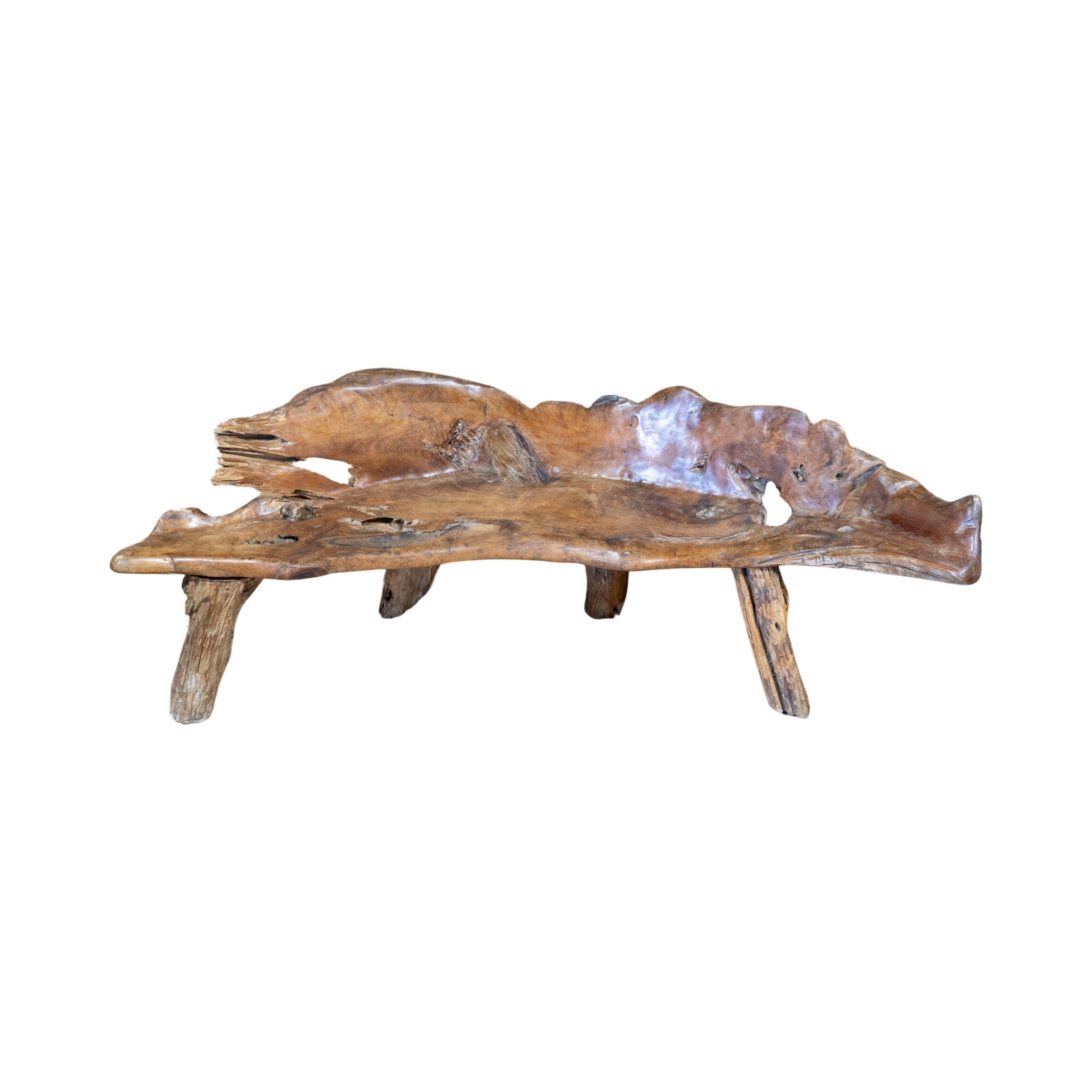 This unique garden table set is crafted from a 19th century French olive tree, providing a one-of-a-kind piece for any outdoor or indoor space. The set includes a table and two wide bench-style chairs, perfect for creating an earthy and inviting atmosphere. Made with natural olive wood, this set is both beautiful and durable.