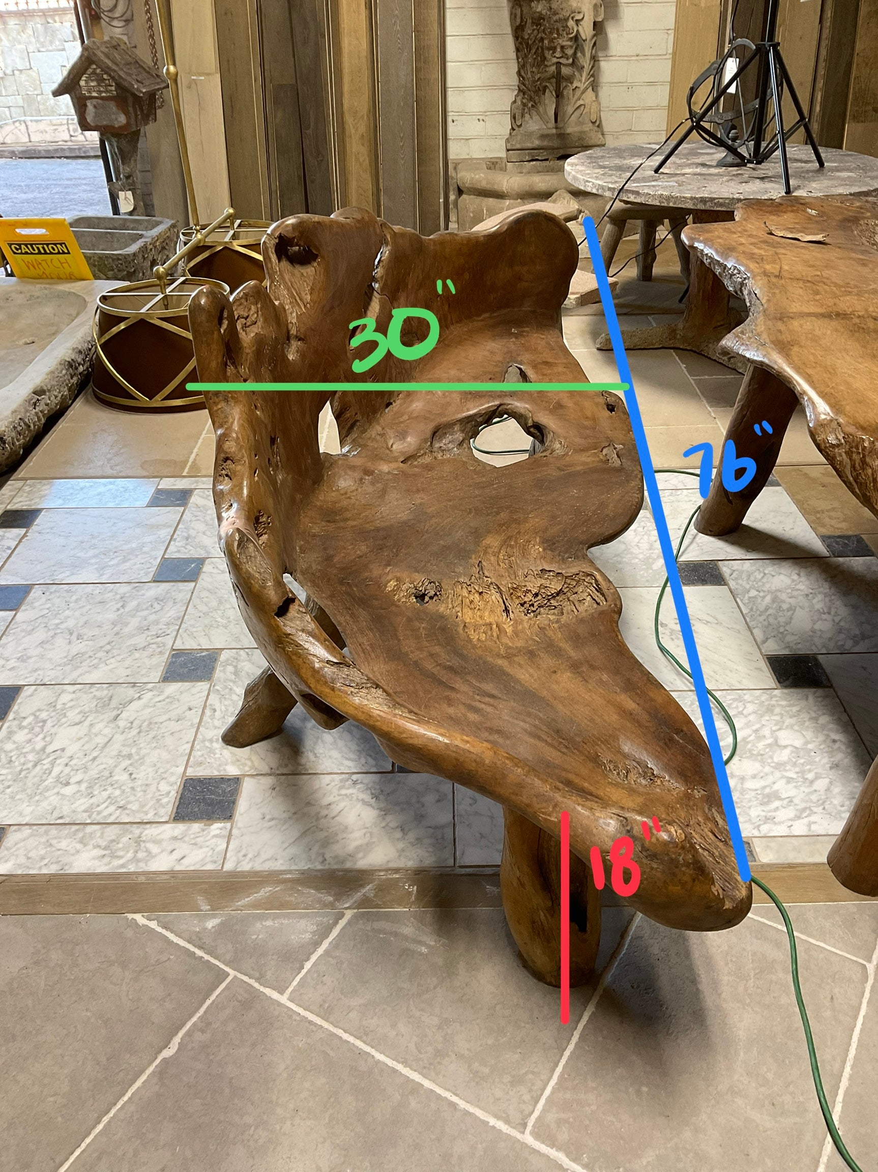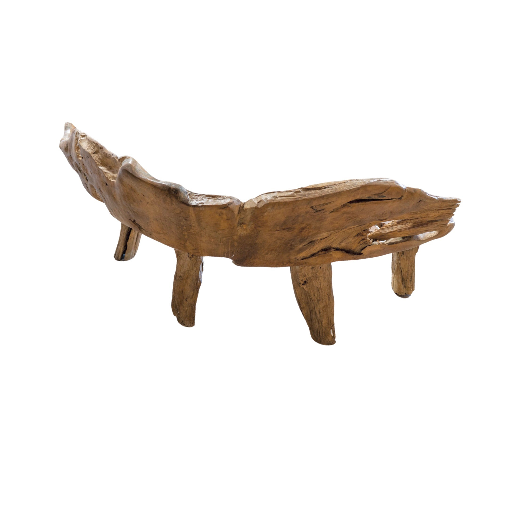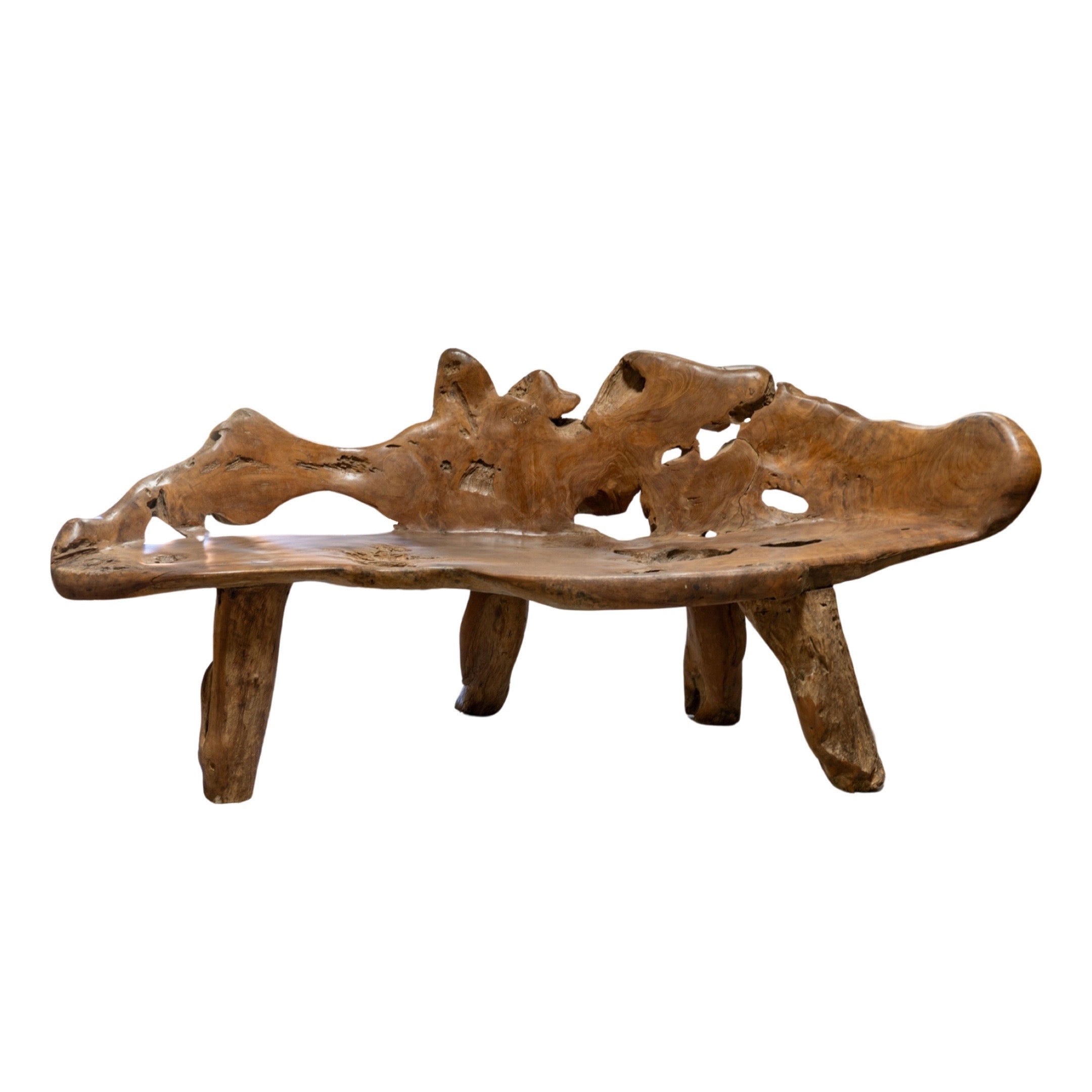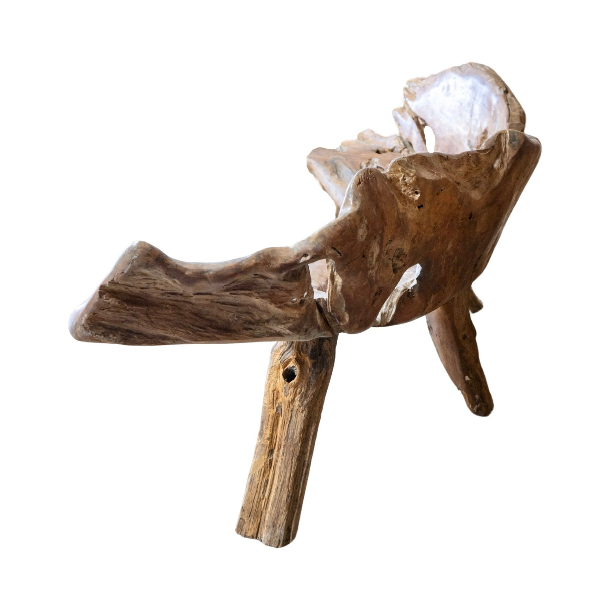 This unique garden table set is crafted from a 19th century French olive tree, providing a one-of-a-kind piece for any outdoor or indoor space. The set includes a table and two wide bench-style chairs, perfect for creating an earthy and inviting atmosphere. Made with natural olive wood, this set is both beautiful and durable.