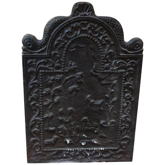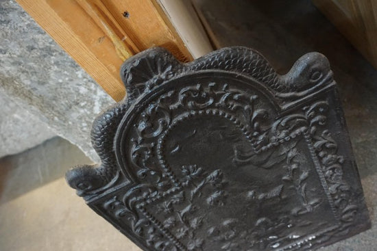 Iron fireback originates from France, circa 1880s. Features a floral, romantic motif and nice curves.